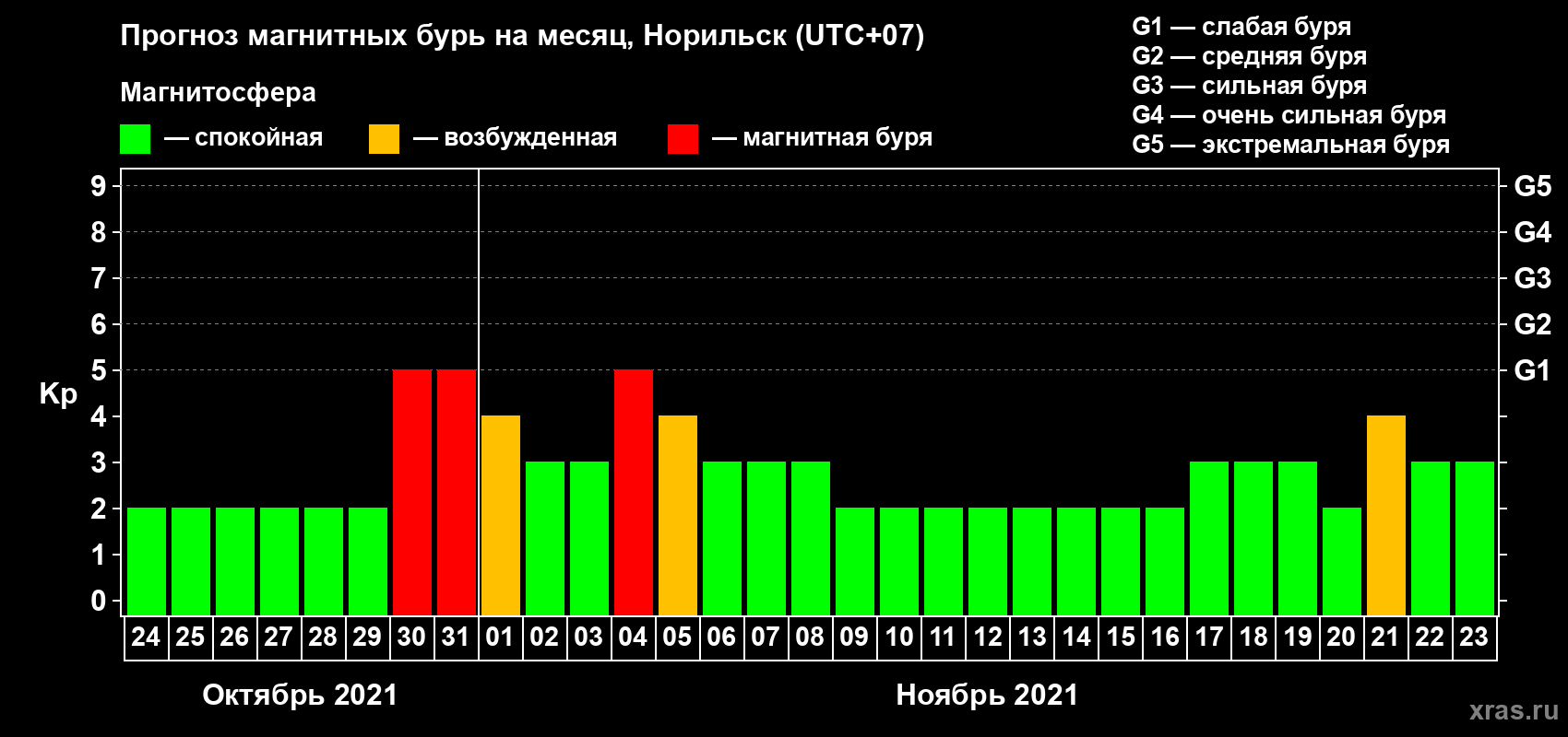 Прогноз магнитных бурь в Норильске — 24 октября 2021 года