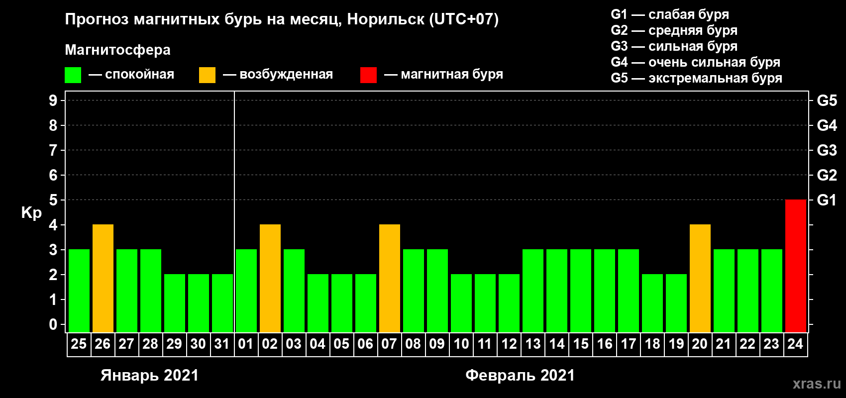 Прогноз магнитных бурь в Норильске — 25 января 2021 года