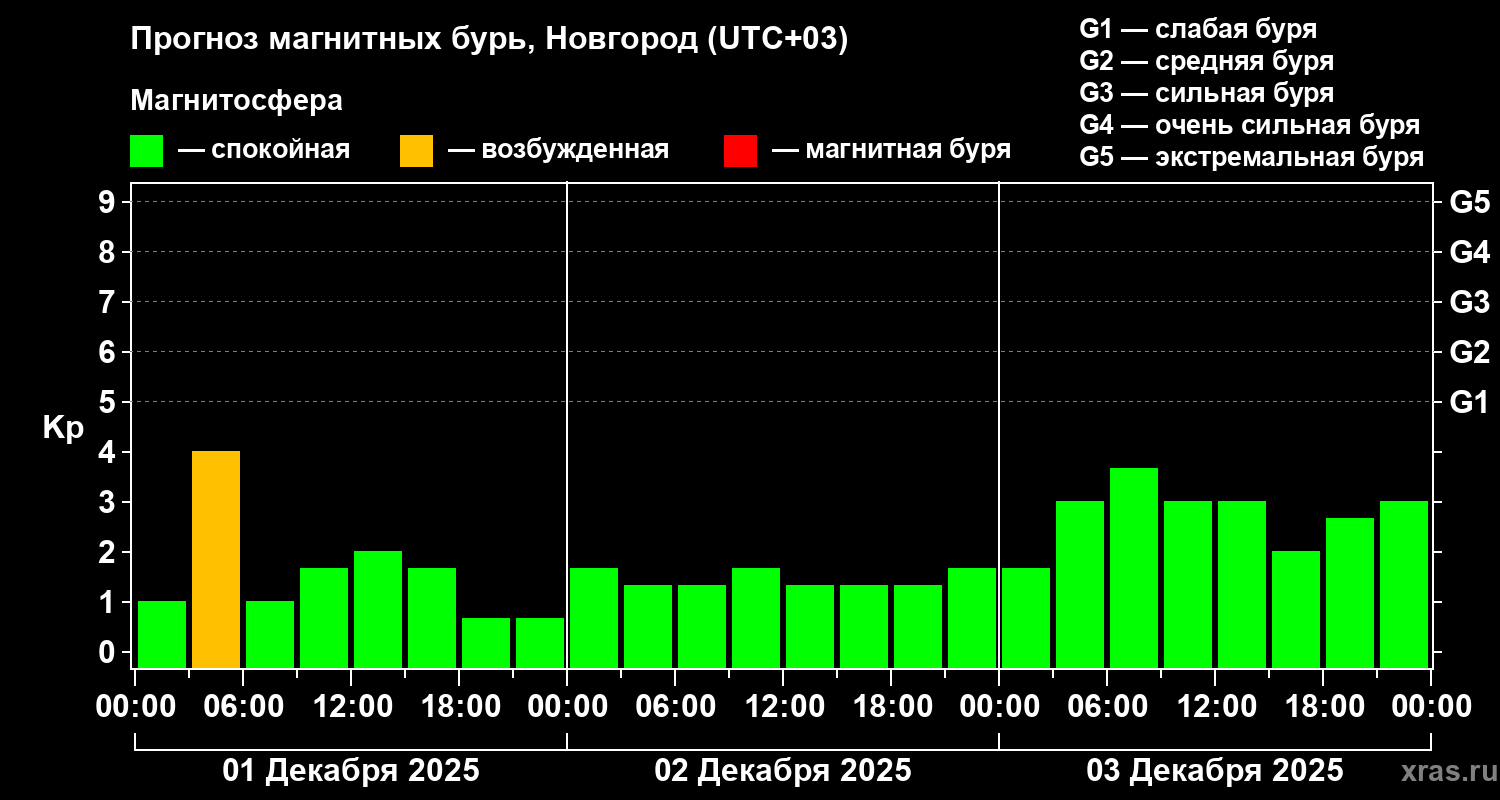 Прогноз магнитных бурь в Новгороде — 1 декабря 2025 года