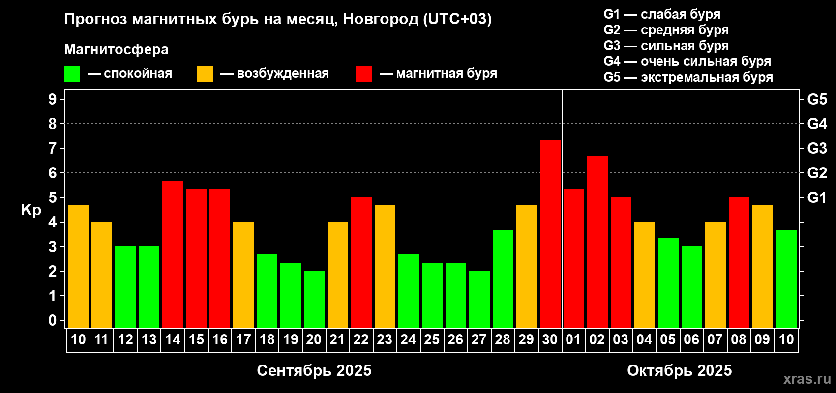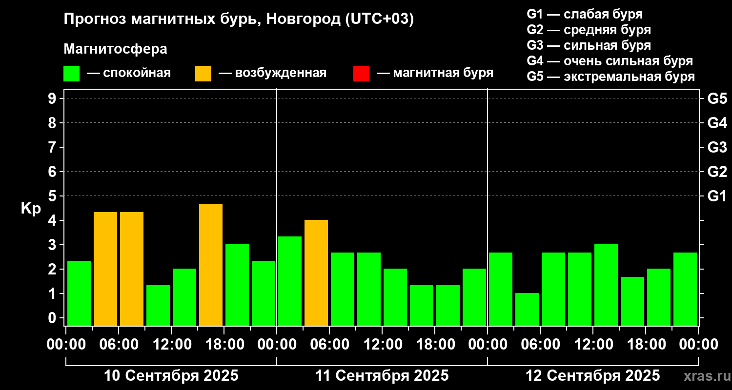 Прогноз магнитных бурь в Новгороде — 10 сентября 2025 года