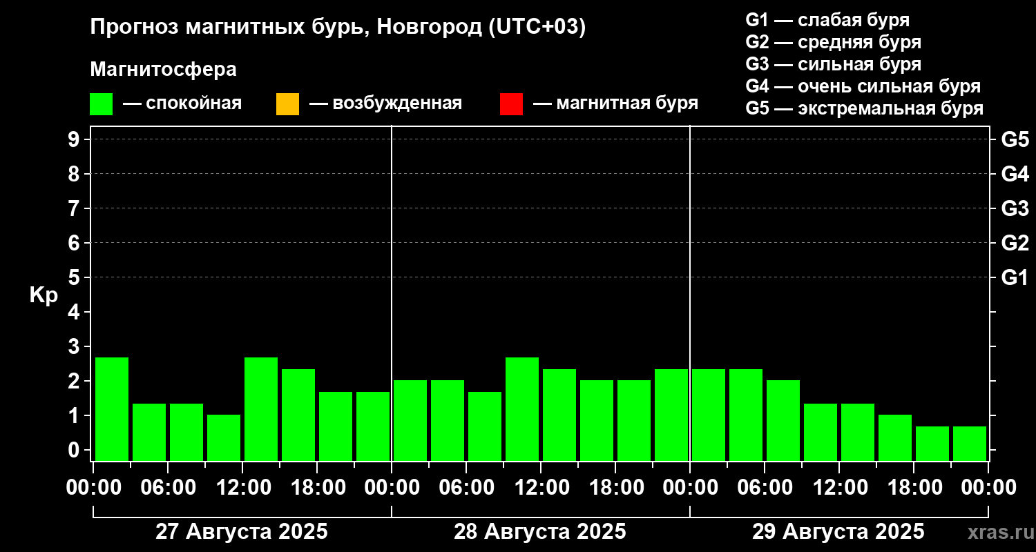Прогноз магнитных бурь в Новгороде на 27 августа 2025 года