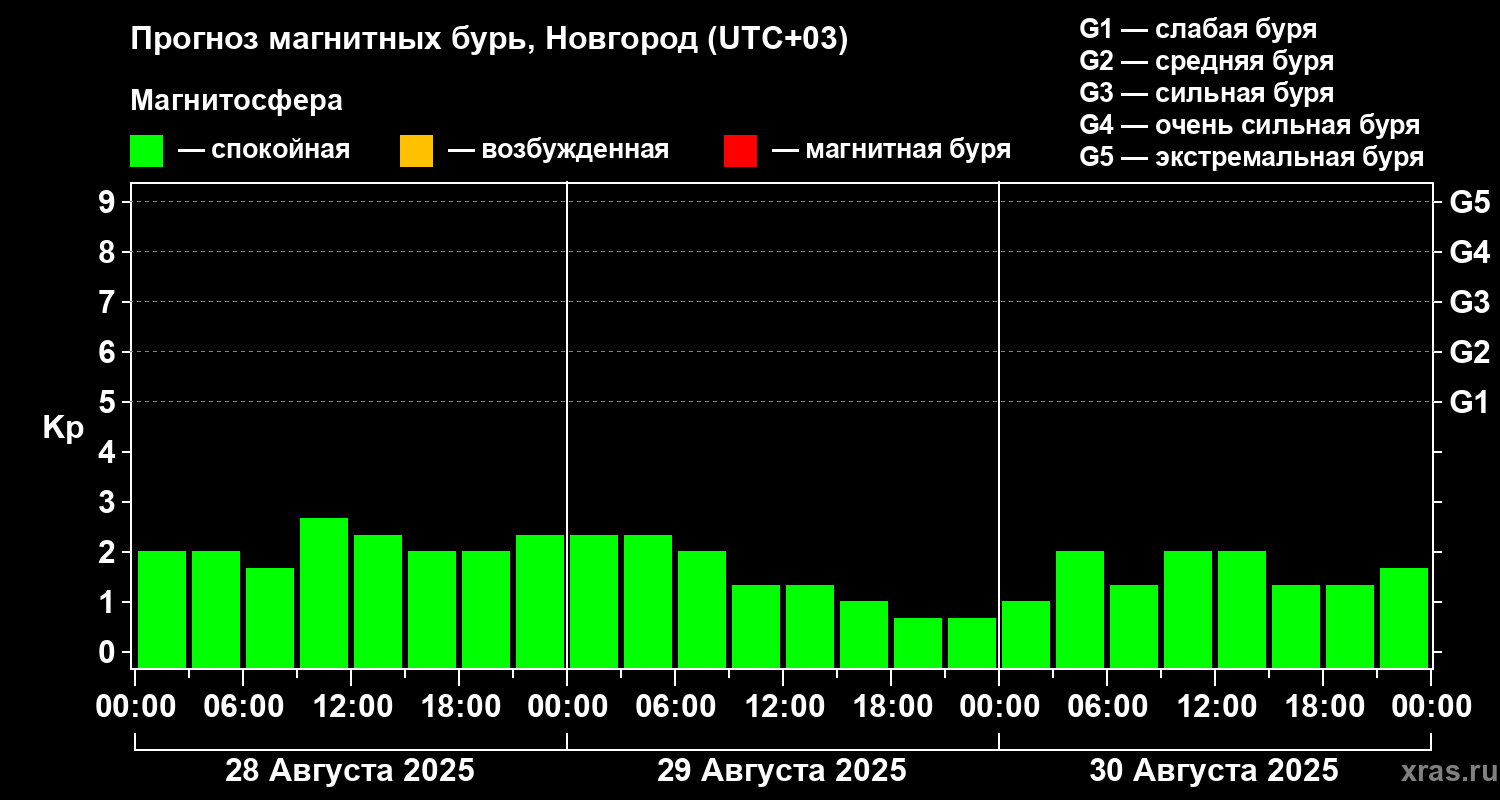Прогноз магнитных бурь в Новгороде на 28 августа 2025 года