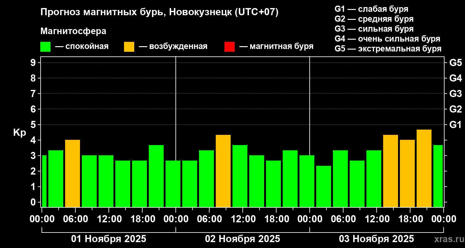 Прогноз магнитных бурь в Новокузнецке — 1 ноября 2025 года