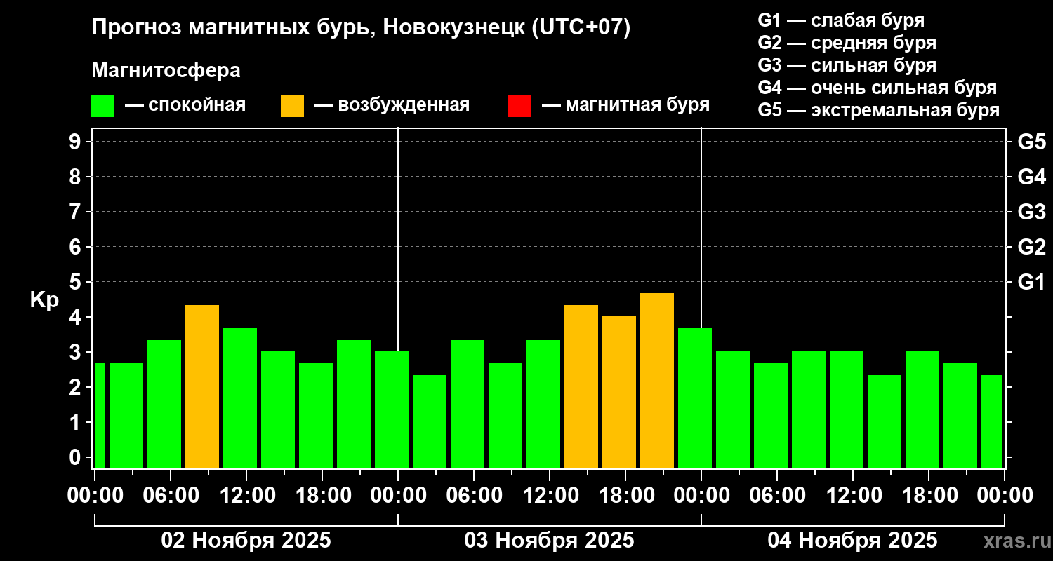 Прогноз магнитных бурь в Новокузнецке — 2 ноября 2025 года