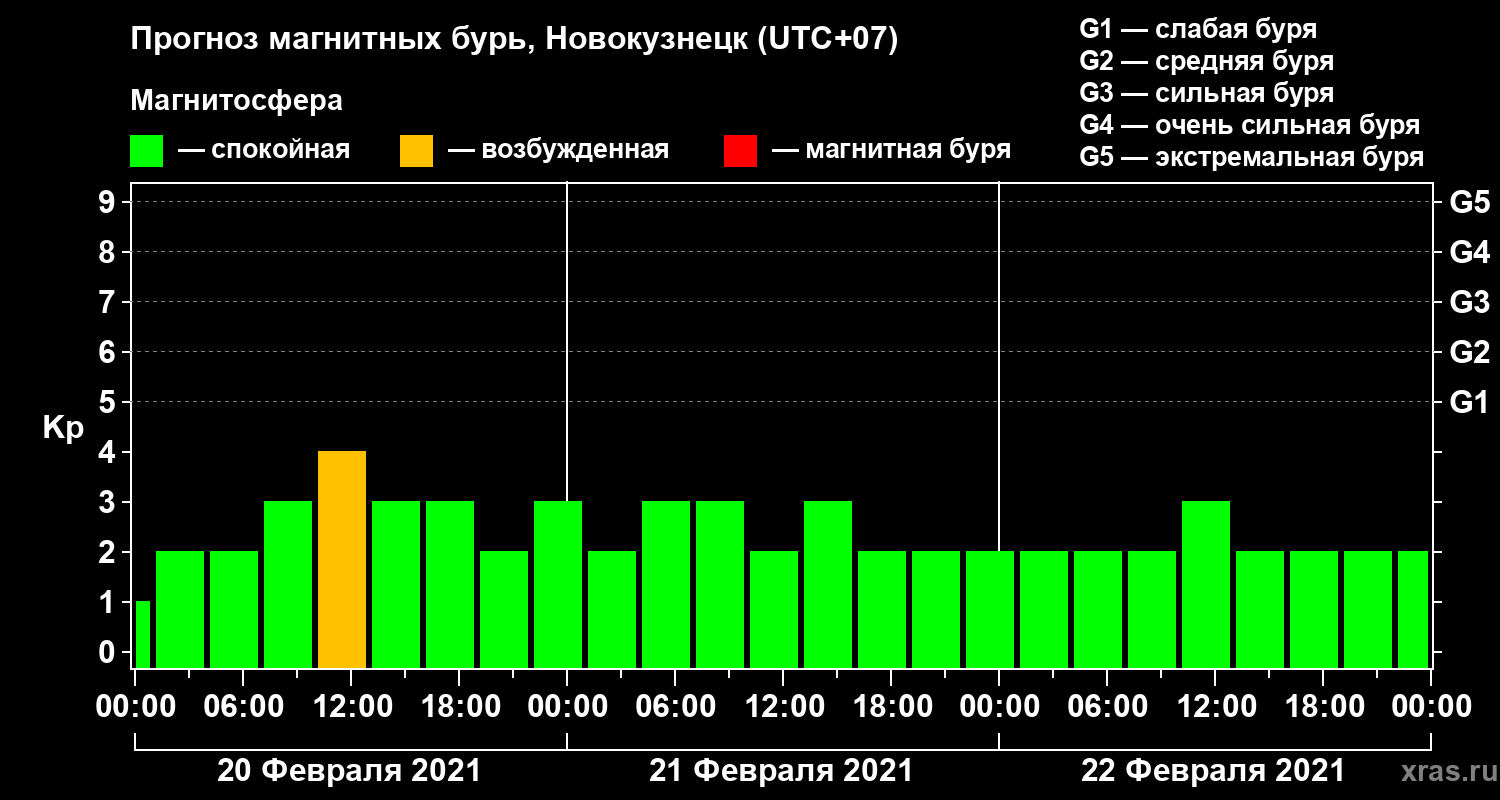 Прогноз магнитных бурь в Новокузнецке на 20 февраля 2021 года