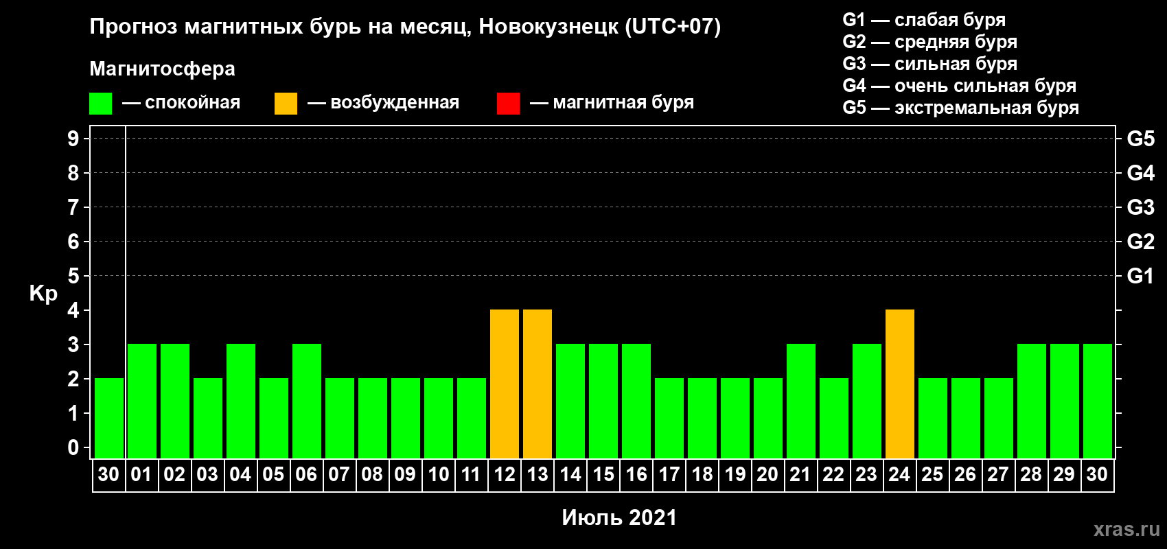 Прогноз магнитных бурь в Новокузнецке — 30 июня 2021 года