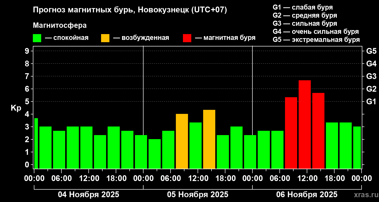 Прогноз магнитных бурь в Новокузнецке — 4 ноября 2025 года
