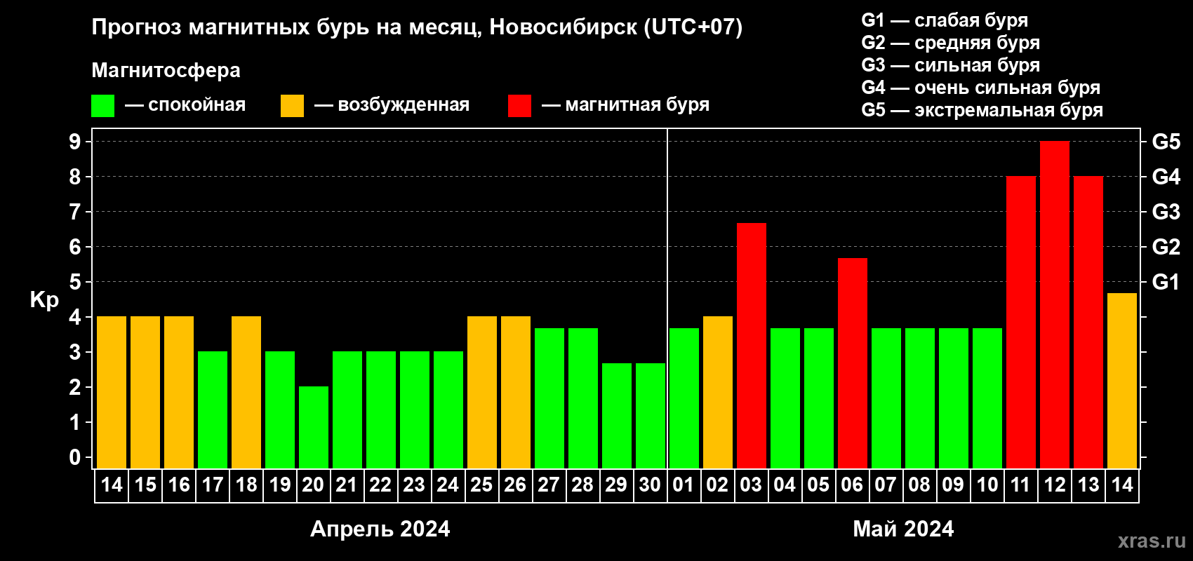 Прогноз магнитных бурь в Новосибирске — 14 апреля 2024 года