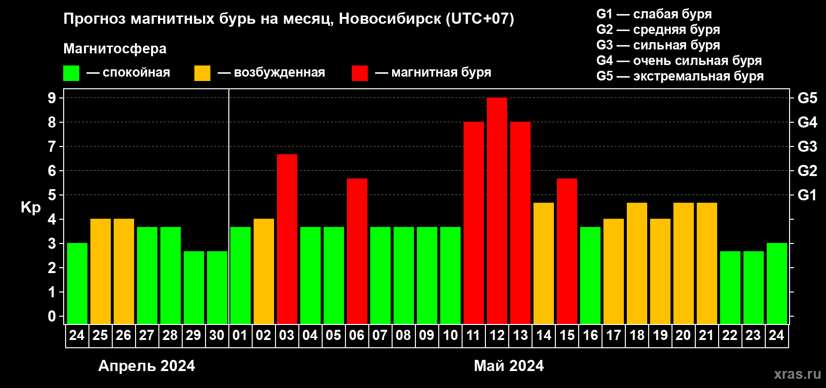 Прогноз магнитных бурь в Новосибирске — 24 апреля 2024 года