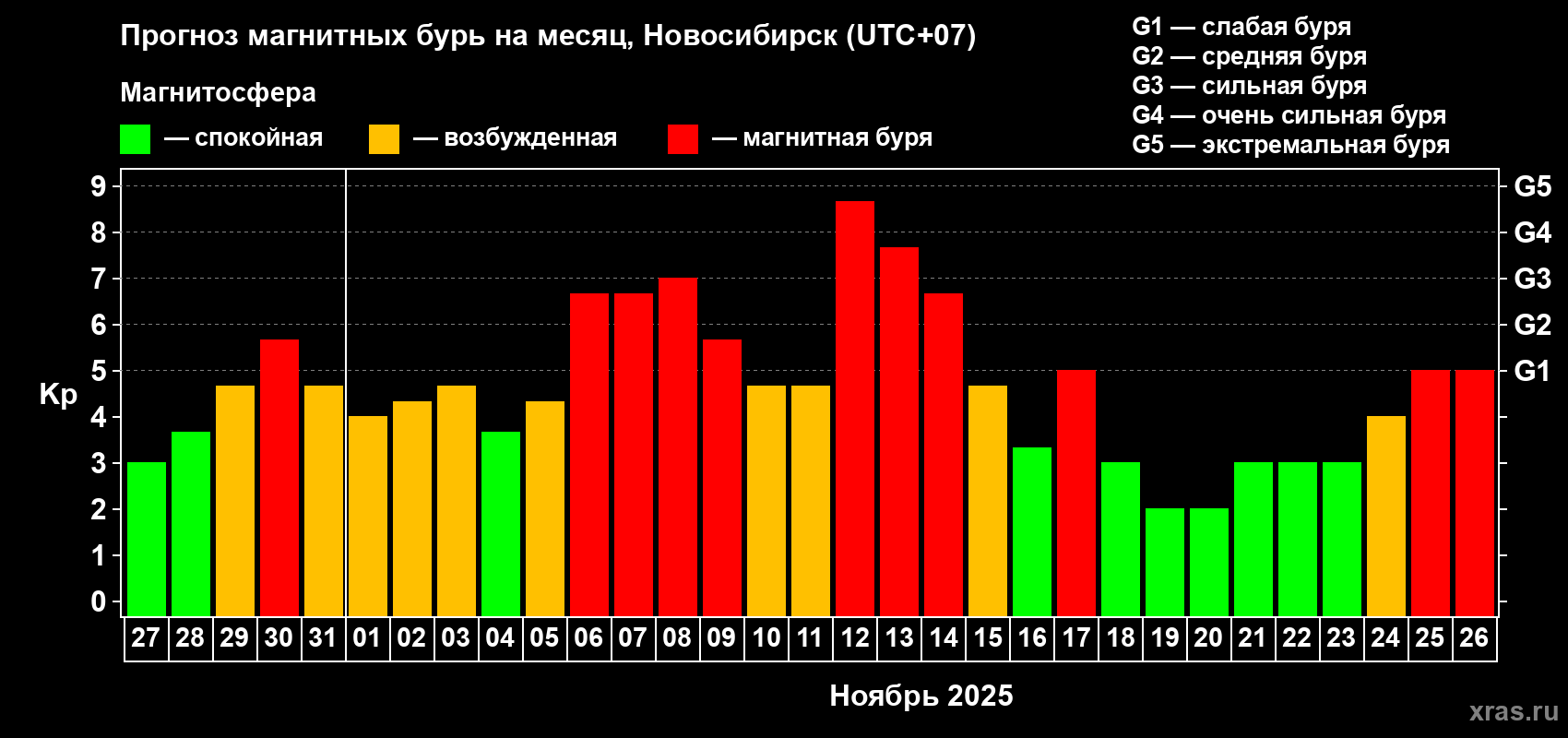 Прогноз магнитных бурь в Новосибирске — 27 октября 2025 года