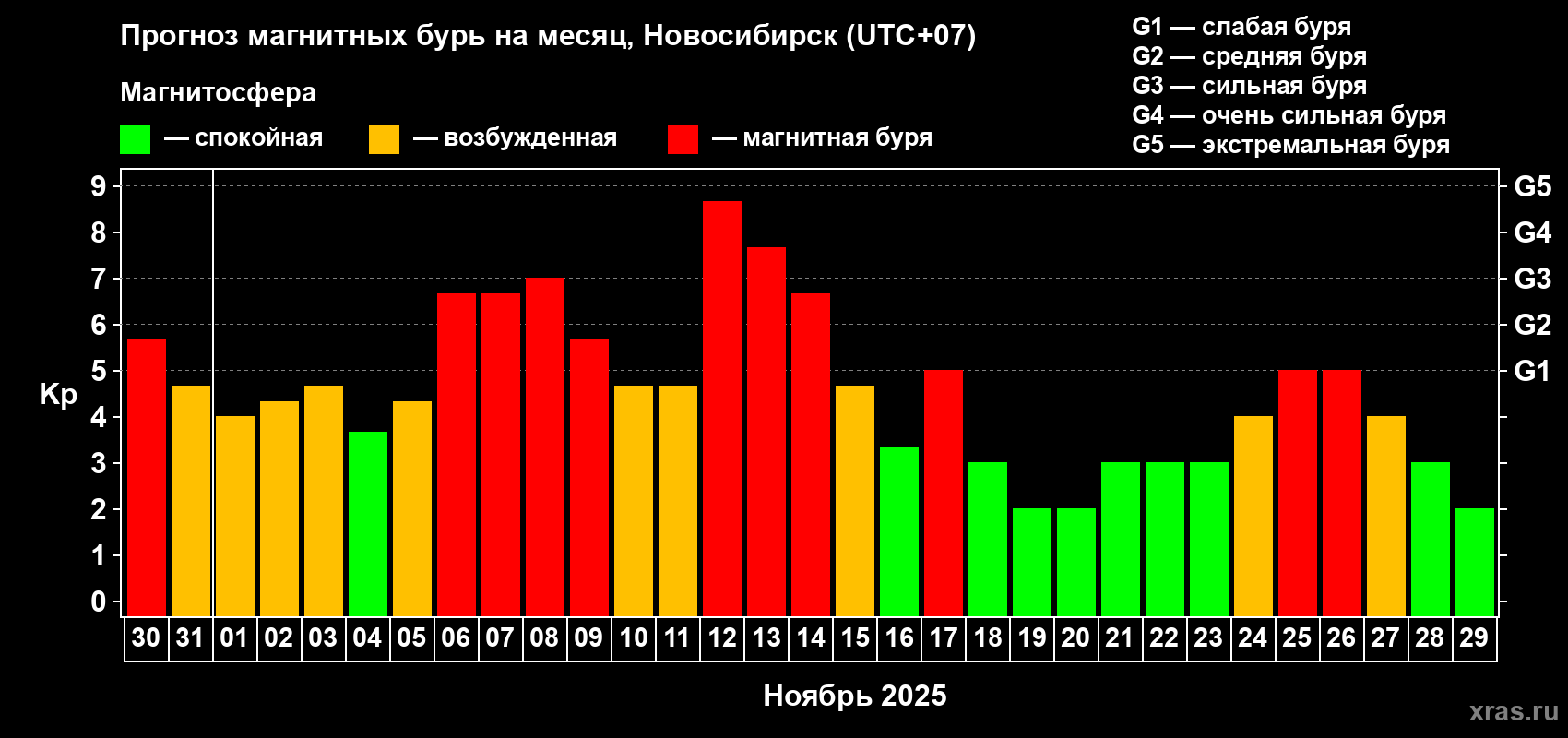 Прогноз магнитных бурь в Новосибирске на 30 октября 2025 года