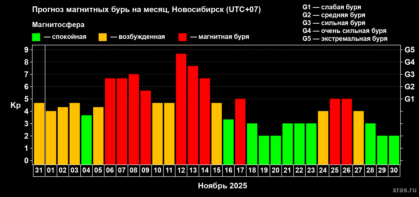 Прогноз магнитных бурь в Новосибирске — 31 октября 2025 года