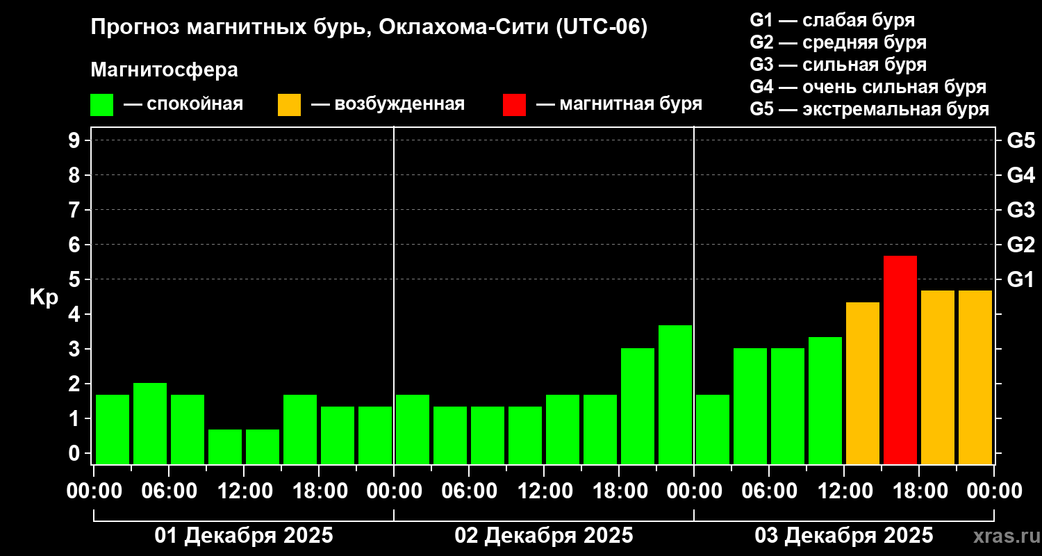 Прогноз магнитных бурь Оклахома-Сити на 1 декабря 2025 года