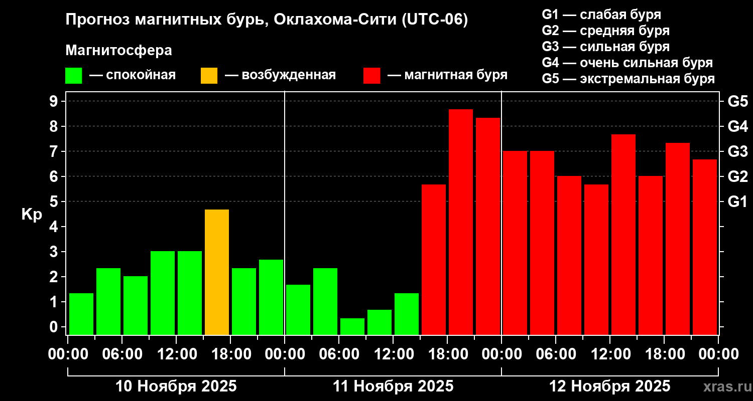 Прогноз магнитных бурь Оклахома-Сити — 10 ноября 2025 года
