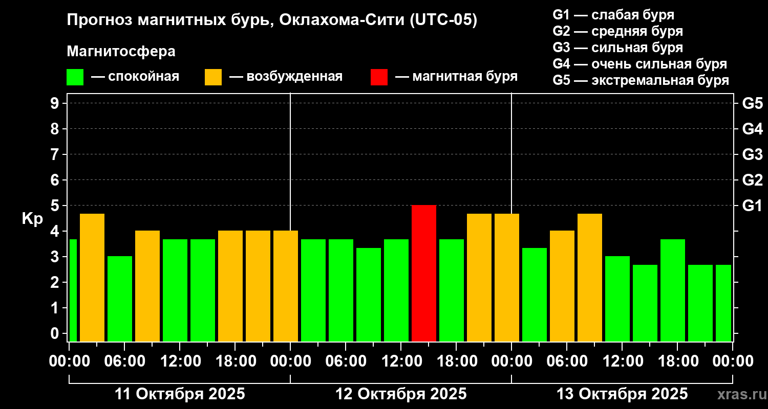 Прогноз магнитных бурь Оклахома-Сити на 11 октября 2025 года