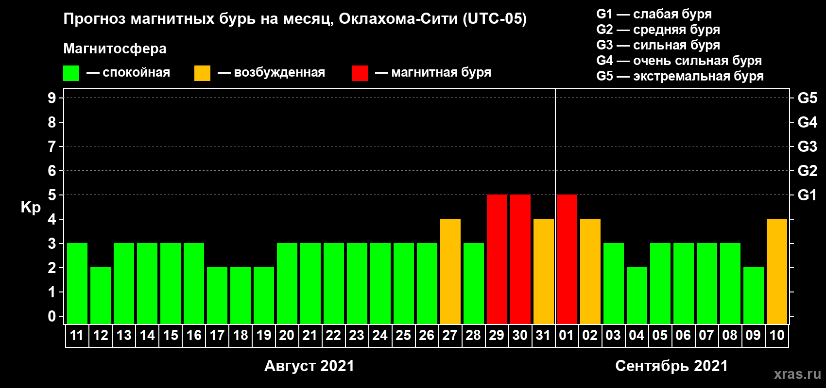 Прогноз магнитных бурь Оклахома-Сити на 11 августа 2021 года