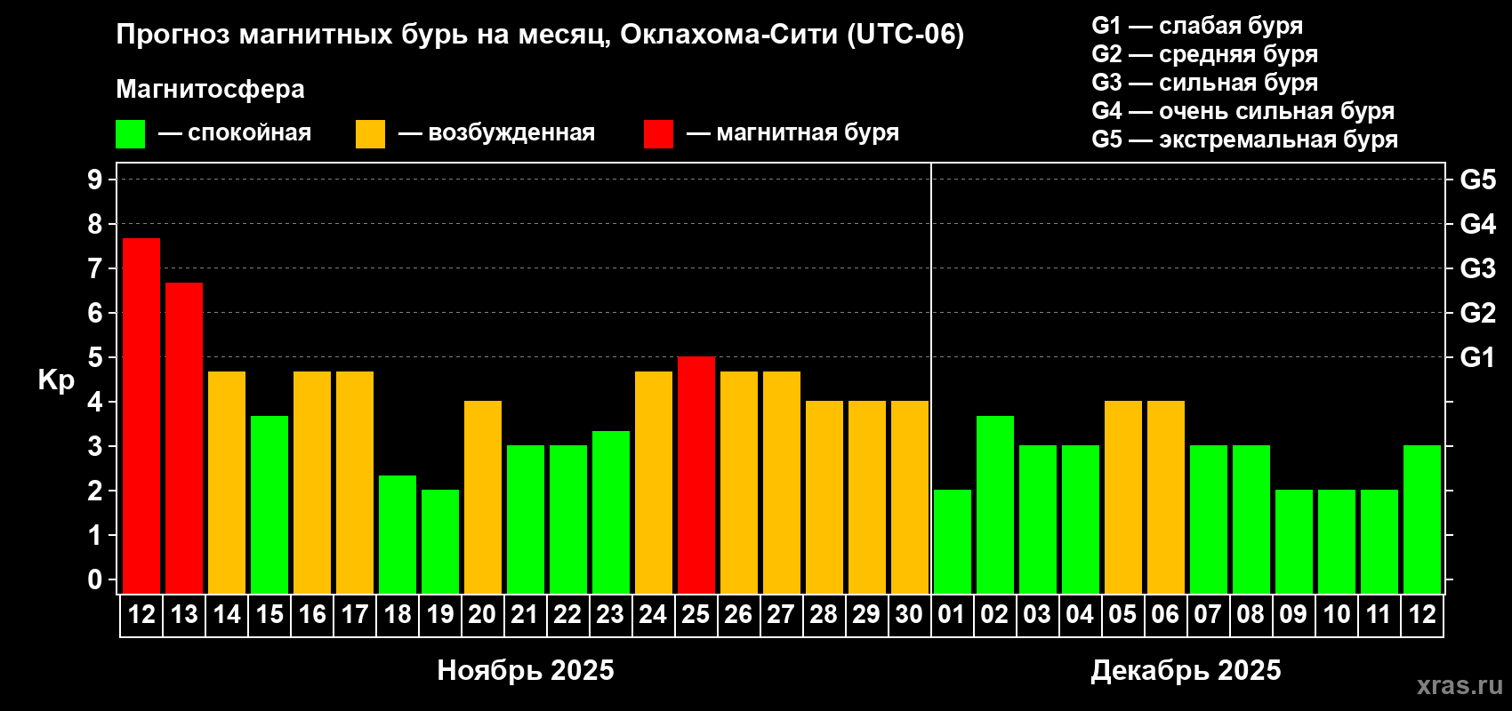 Прогноз магнитных бурь Оклахома-Сити на 12 ноября 2025 года