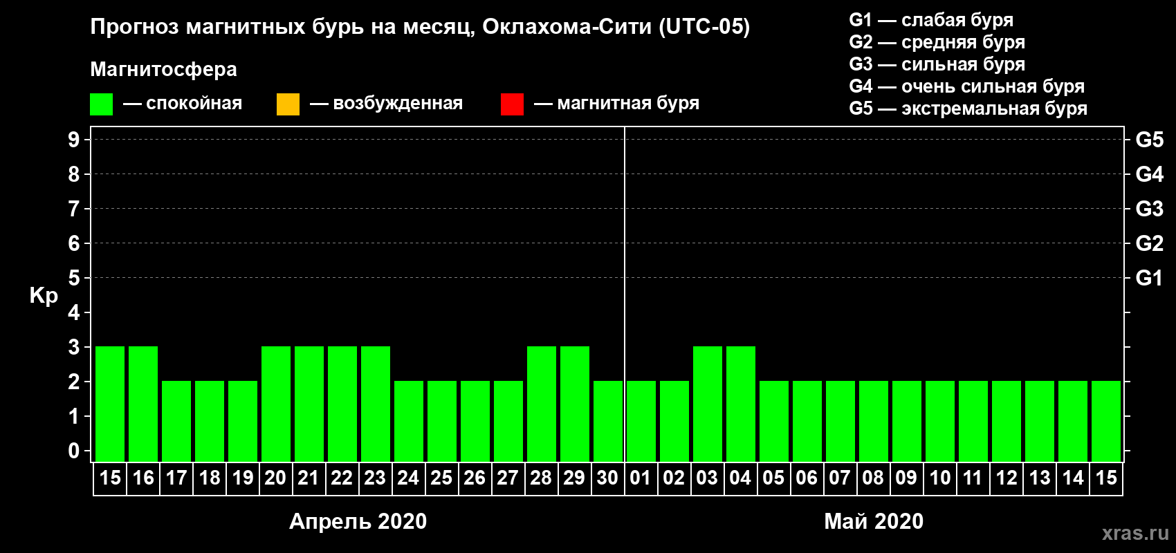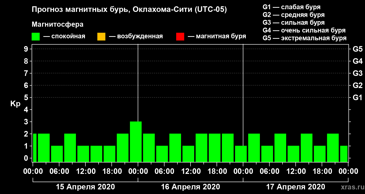 Прогноз магнитных бурь Оклахома-Сити на 15 апреля 2020 года