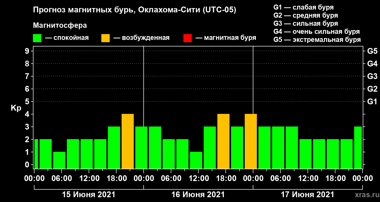 Прогноз магнитных бурь Оклахома-Сити на 15 июня 2021 года