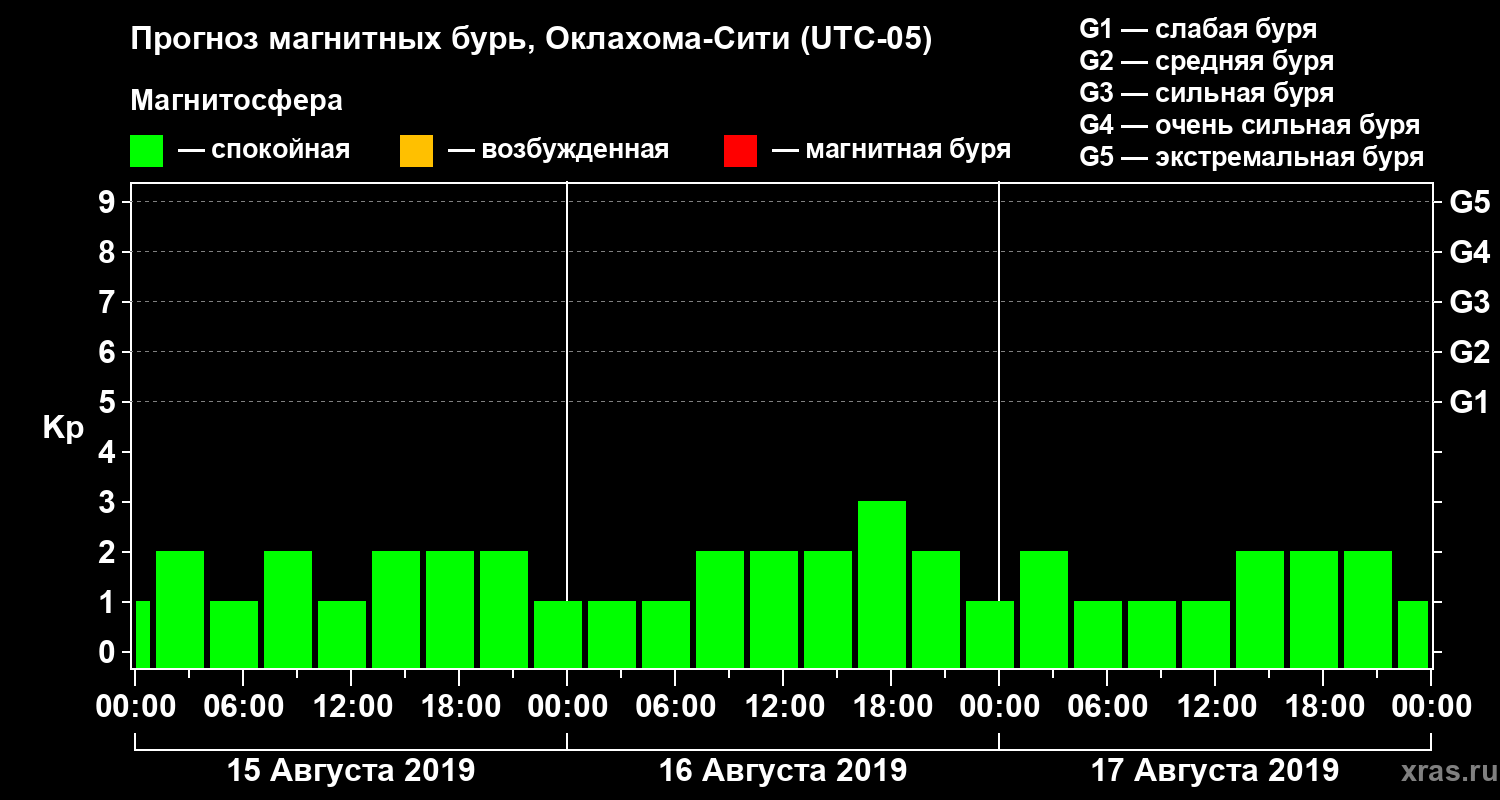 Прогноз магнитных бурь Оклахома-Сити на 15 августа 2019 года