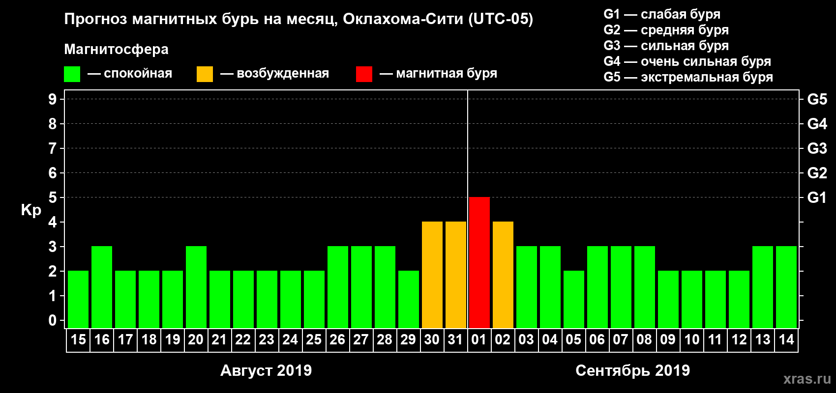 Прогноз магнитных бурь Оклахома-Сити — 15 августа 2019 года