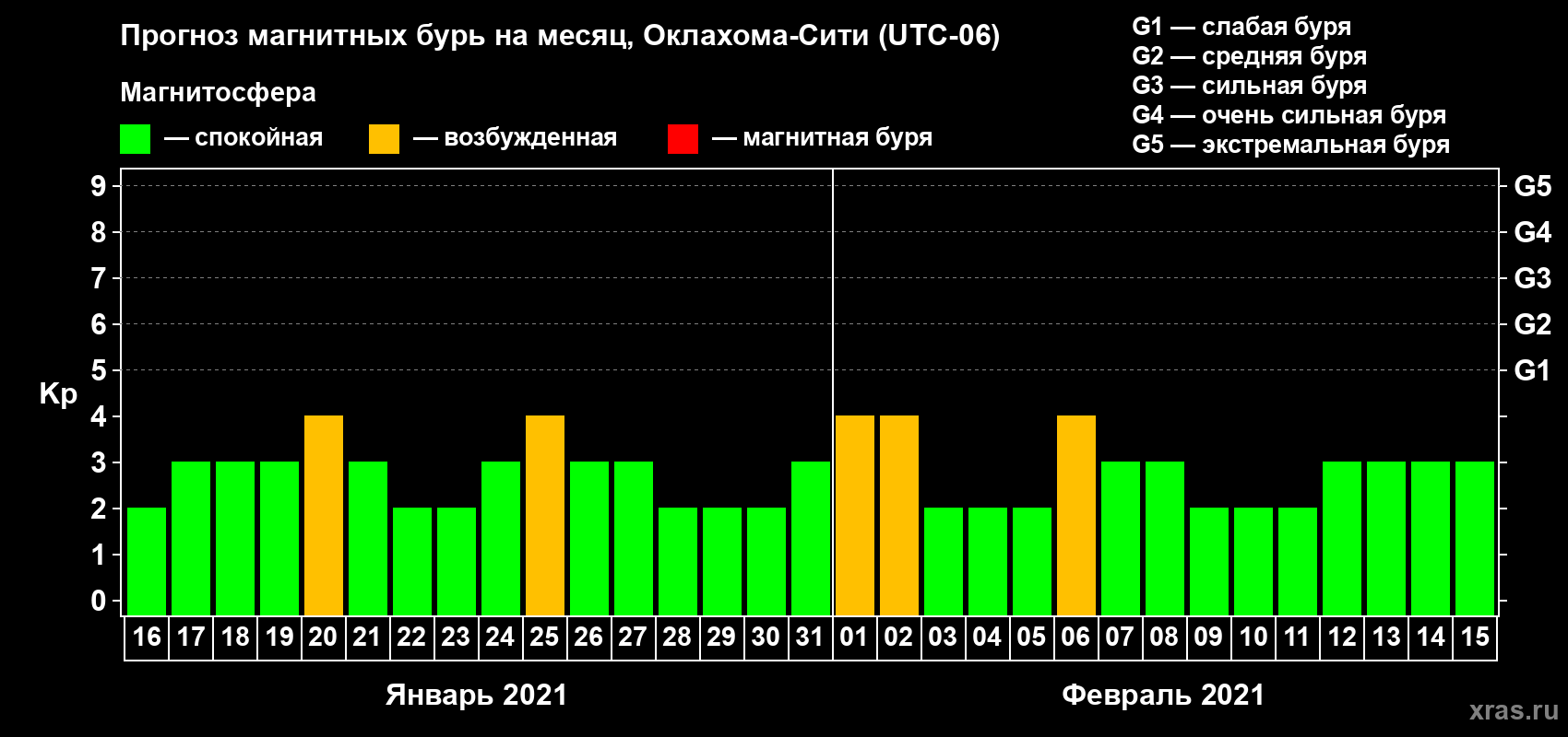 Прогноз магнитных бурь Оклахома-Сити на 16 января 2021 года