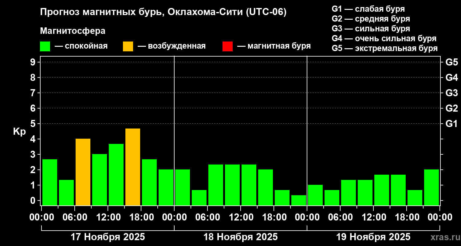 Прогноз магнитных бурь Оклахома-Сити на 17 ноября 2025 года