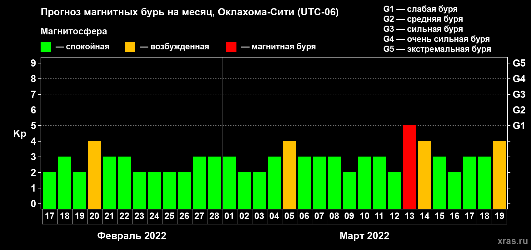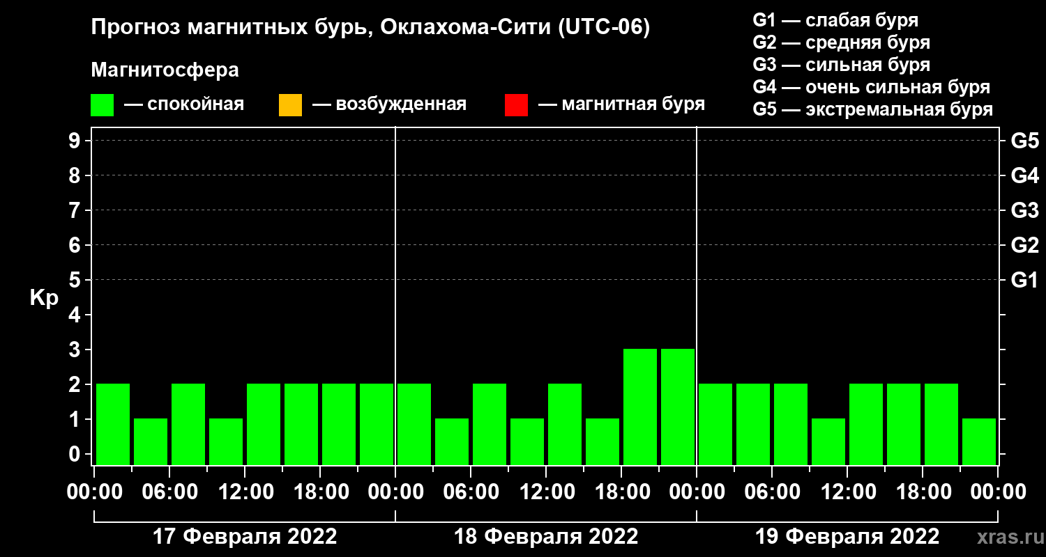 Прогноз магнитных бурь Оклахома-Сити на 17 февраля 2022 года
