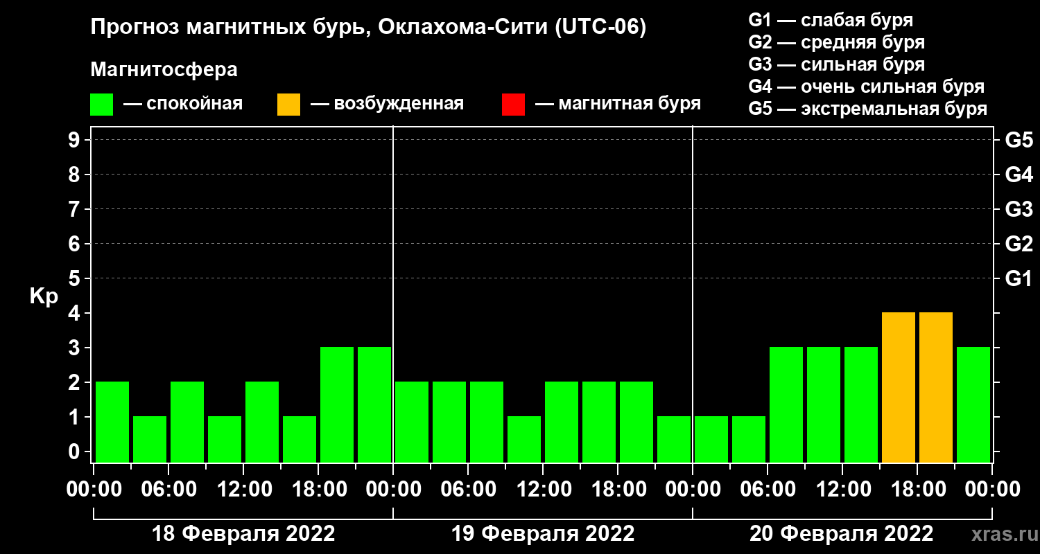Прогноз магнитных бурь Оклахома-Сити на 18 февраля 2022 года