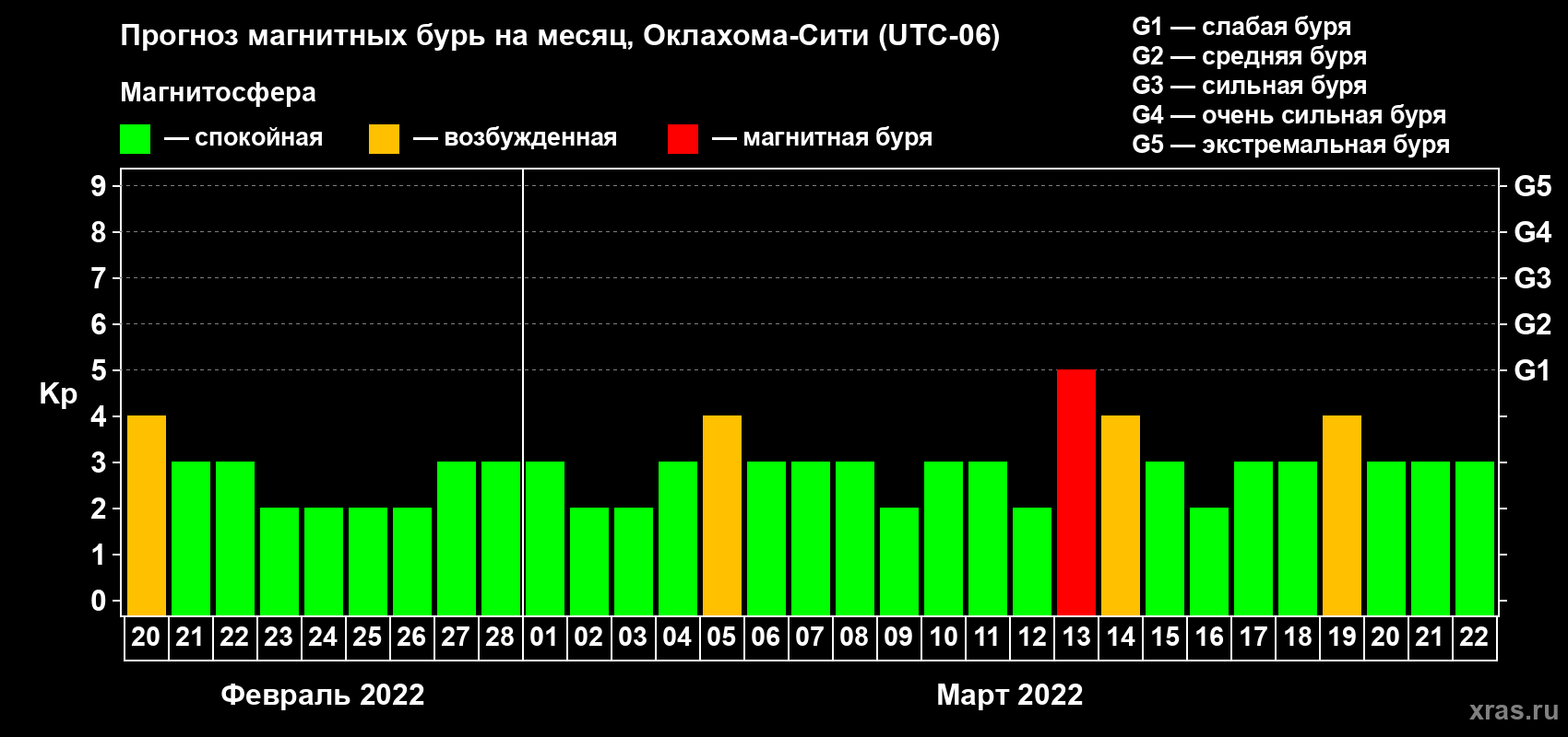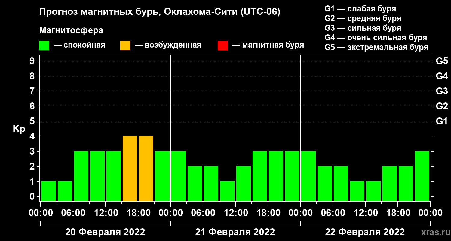 Прогноз магнитных бурь Оклахома-Сити — 20 февраля 2022 года