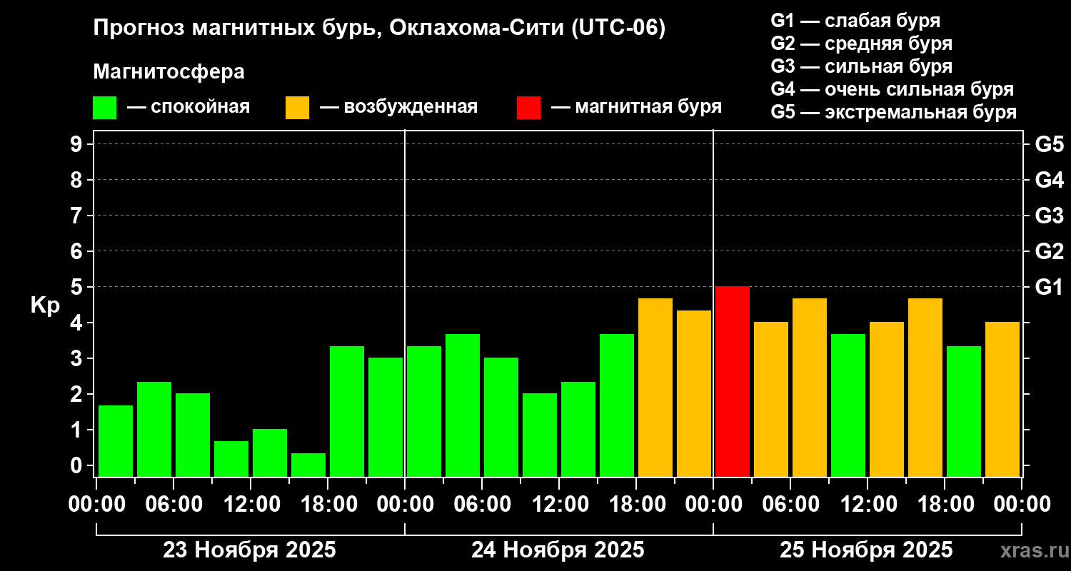 Прогноз магнитных бурь Оклахома-Сити на 23 ноября 2025 года