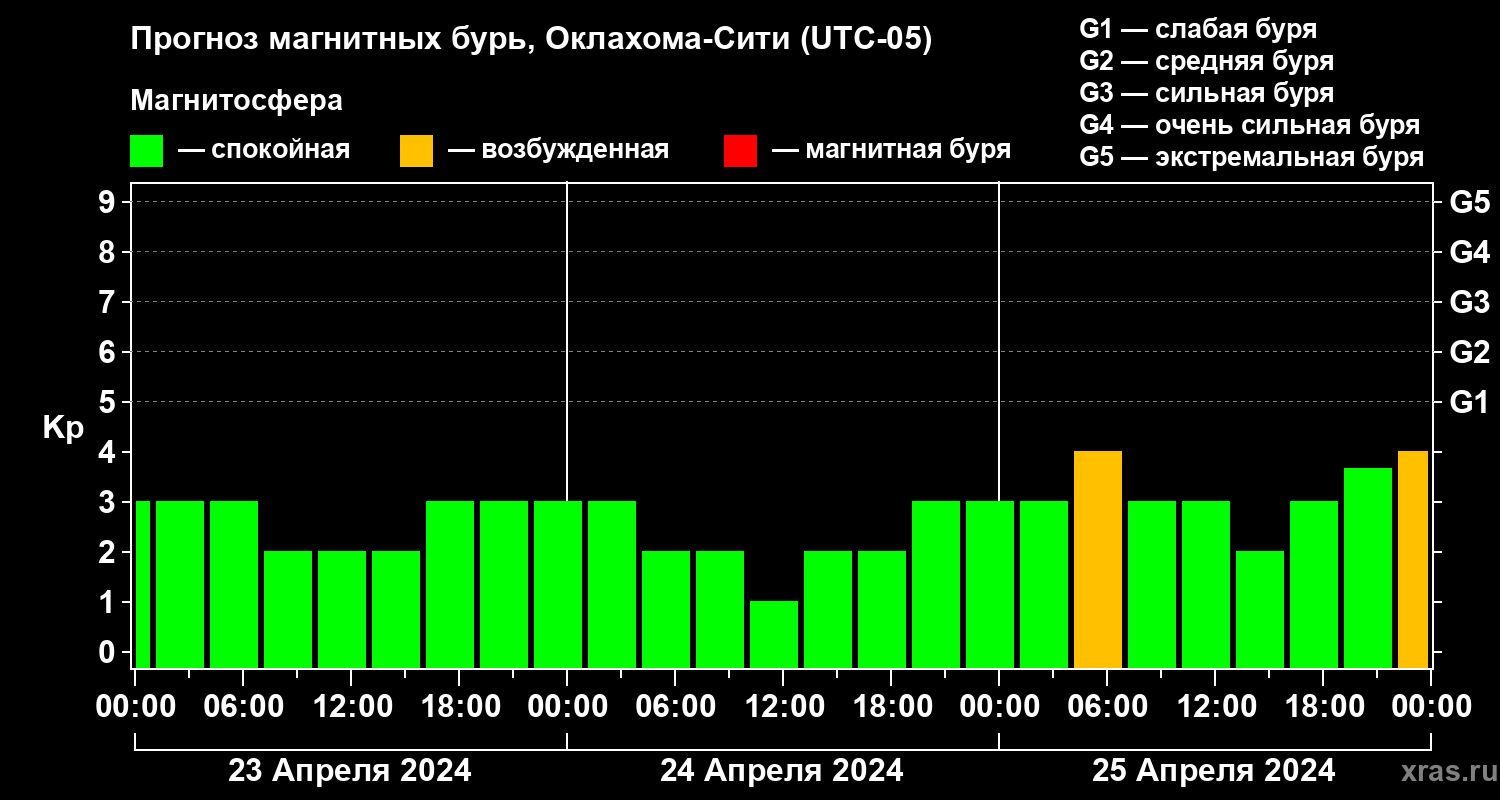 Прогноз магнитных бурь Оклахома-Сити на 23 апреля 2024 года