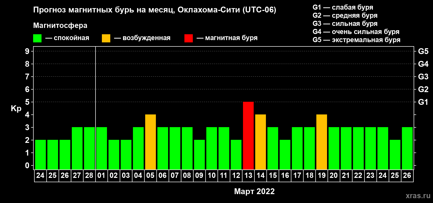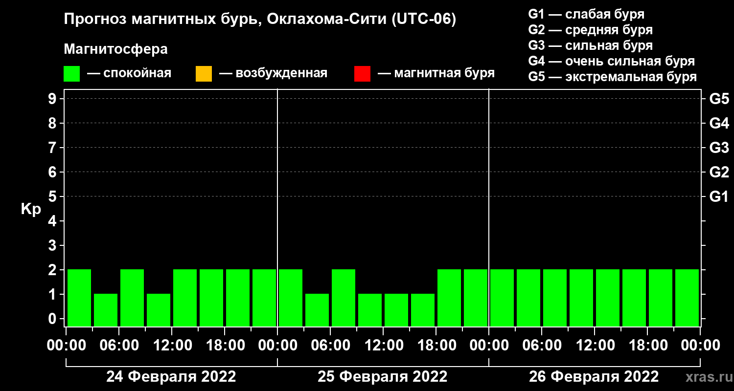 Прогноз магнитных бурь Оклахома-Сити на 24 февраля 2022 года