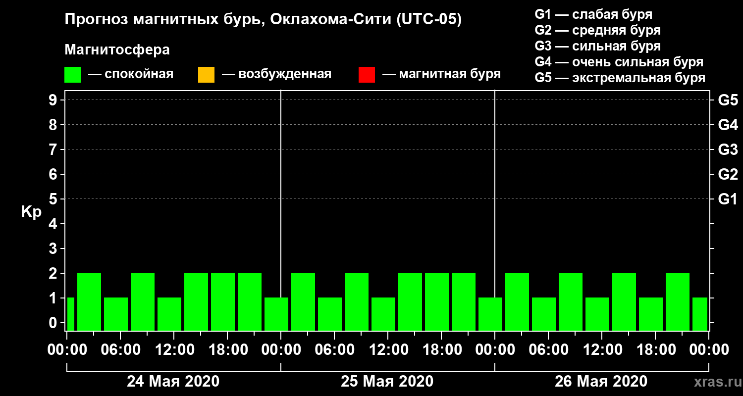 Прогноз магнитных бурь Оклахома-Сити на 24 мая 2020 года