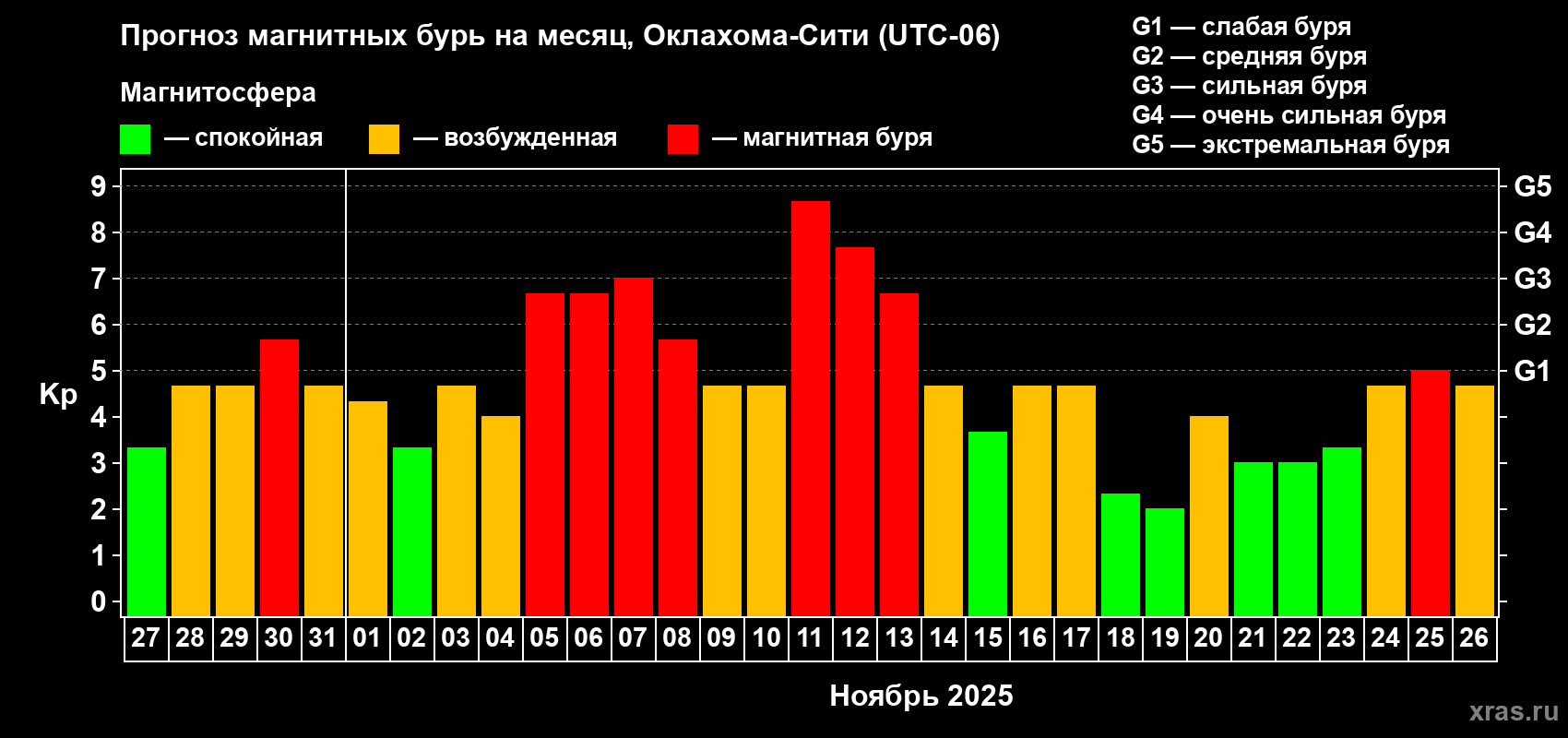 Прогноз магнитных бурь Оклахома-Сити на 27 октября 2025 года