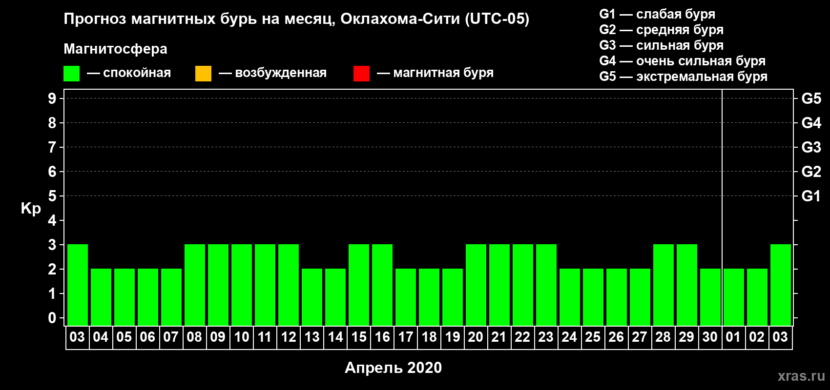 Прогноз магнитных бурь Оклахома-Сити — 3 апреля 2020 года
