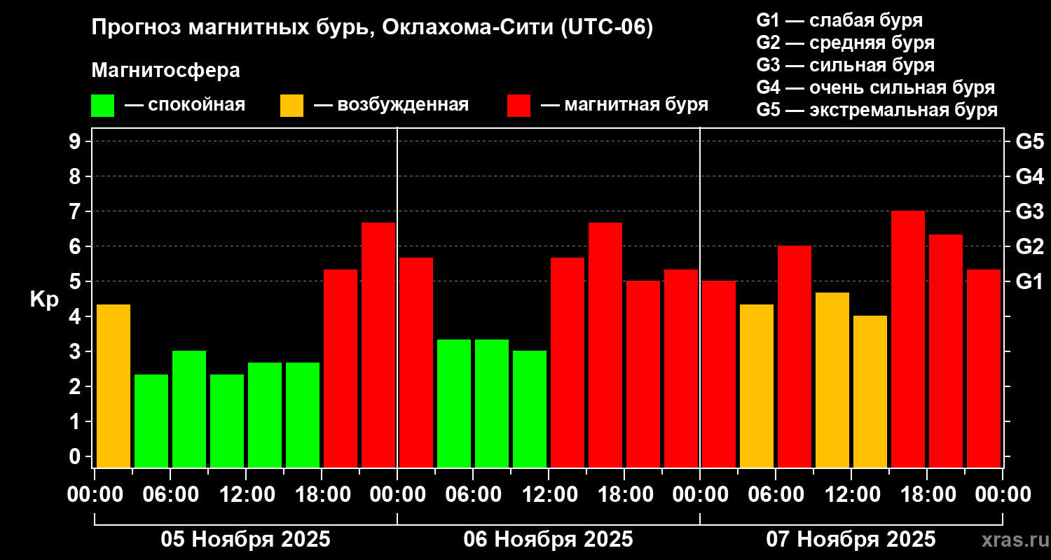 Прогноз магнитных бурь Оклахома-Сити на 5 ноября 2025 года