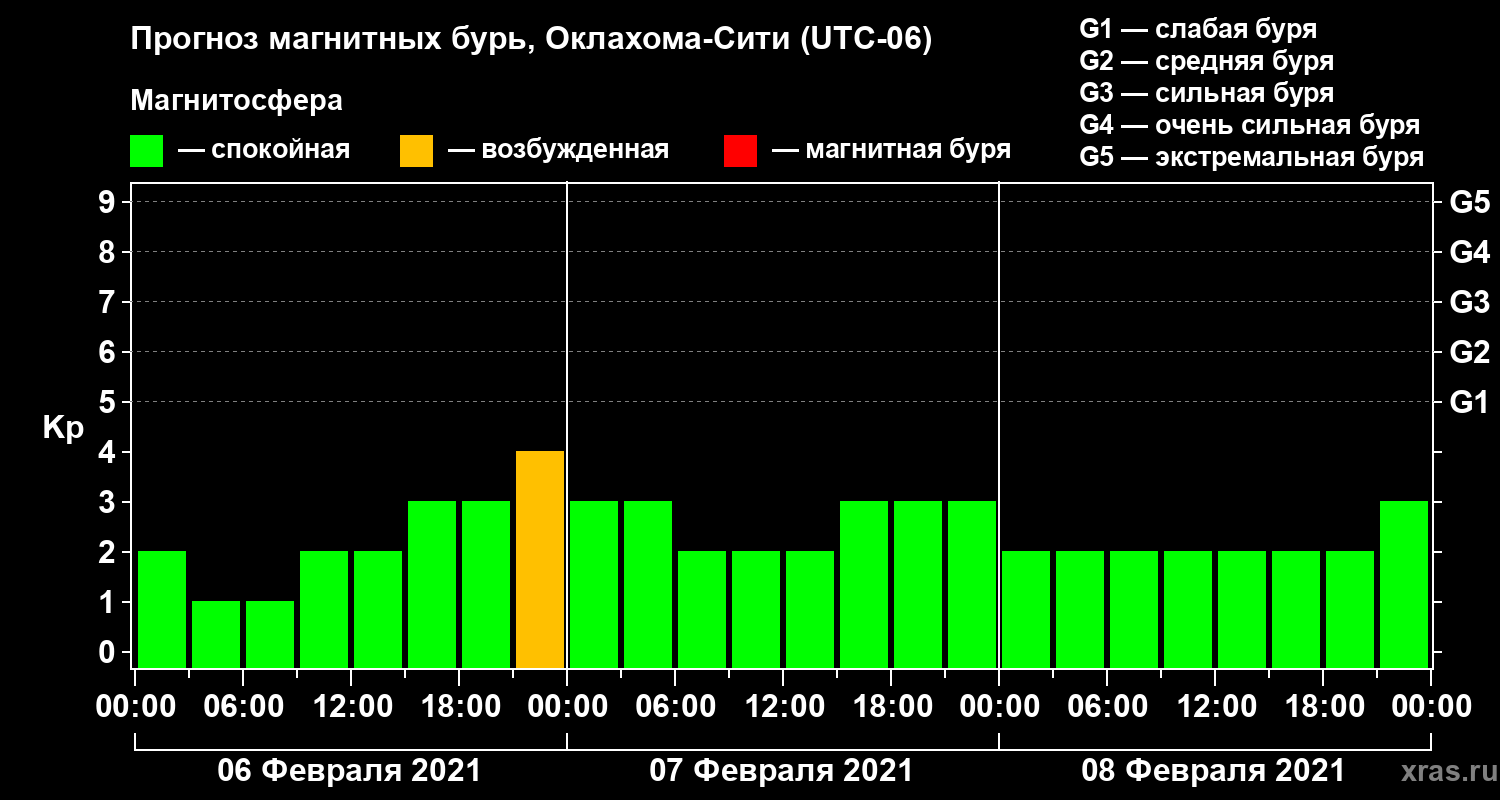 Прогноз магнитных бурь Оклахома-Сити на 6 февраля 2021 года
