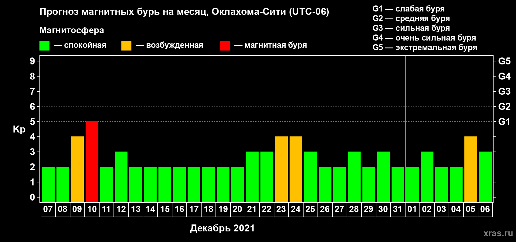 Прогноз магнитных бурь Оклахома-Сити на 7 декабря 2020 года