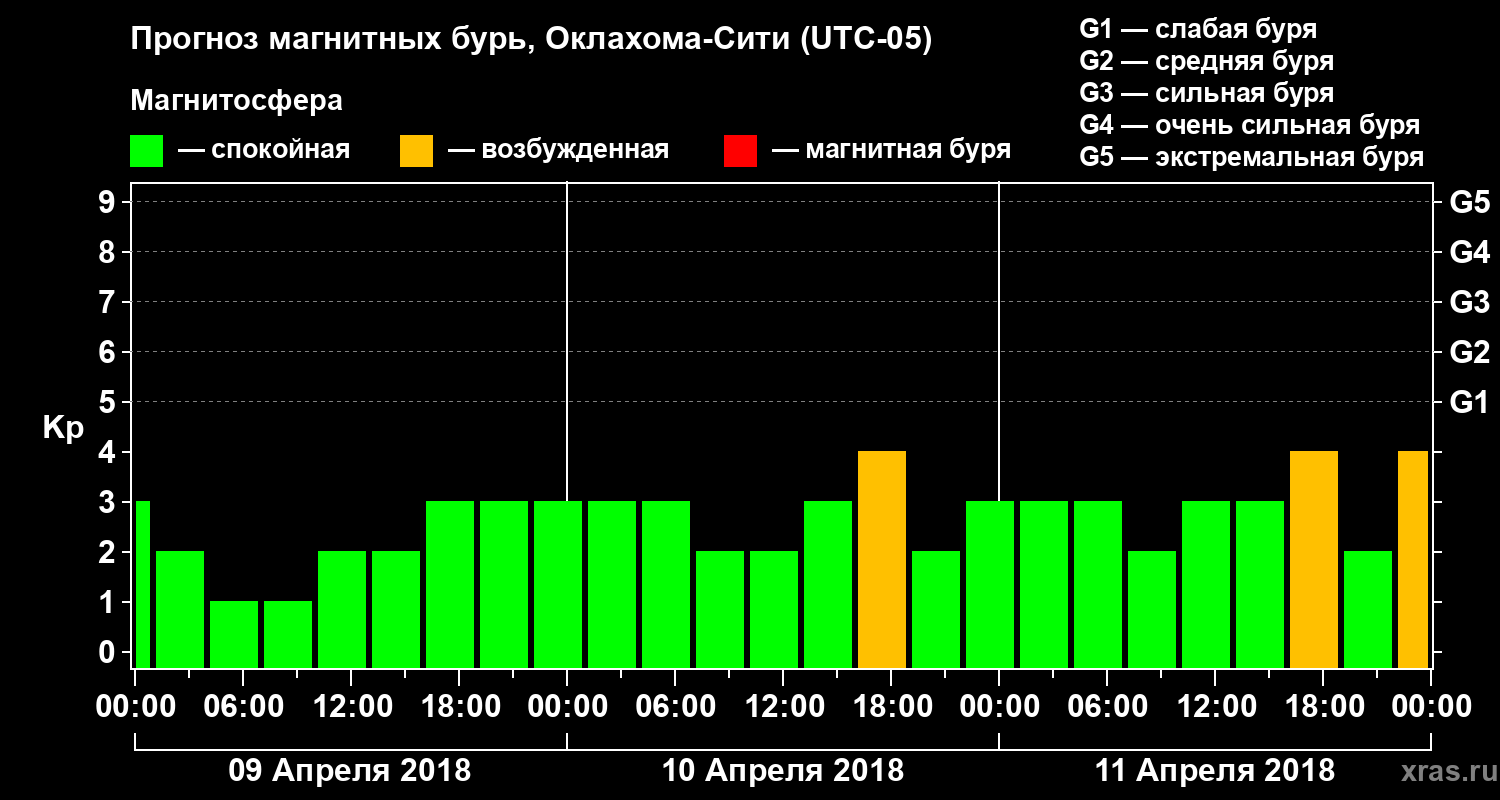 Прогноз магнитных бурь Оклахома-Сити на 9 апреля 2018 года