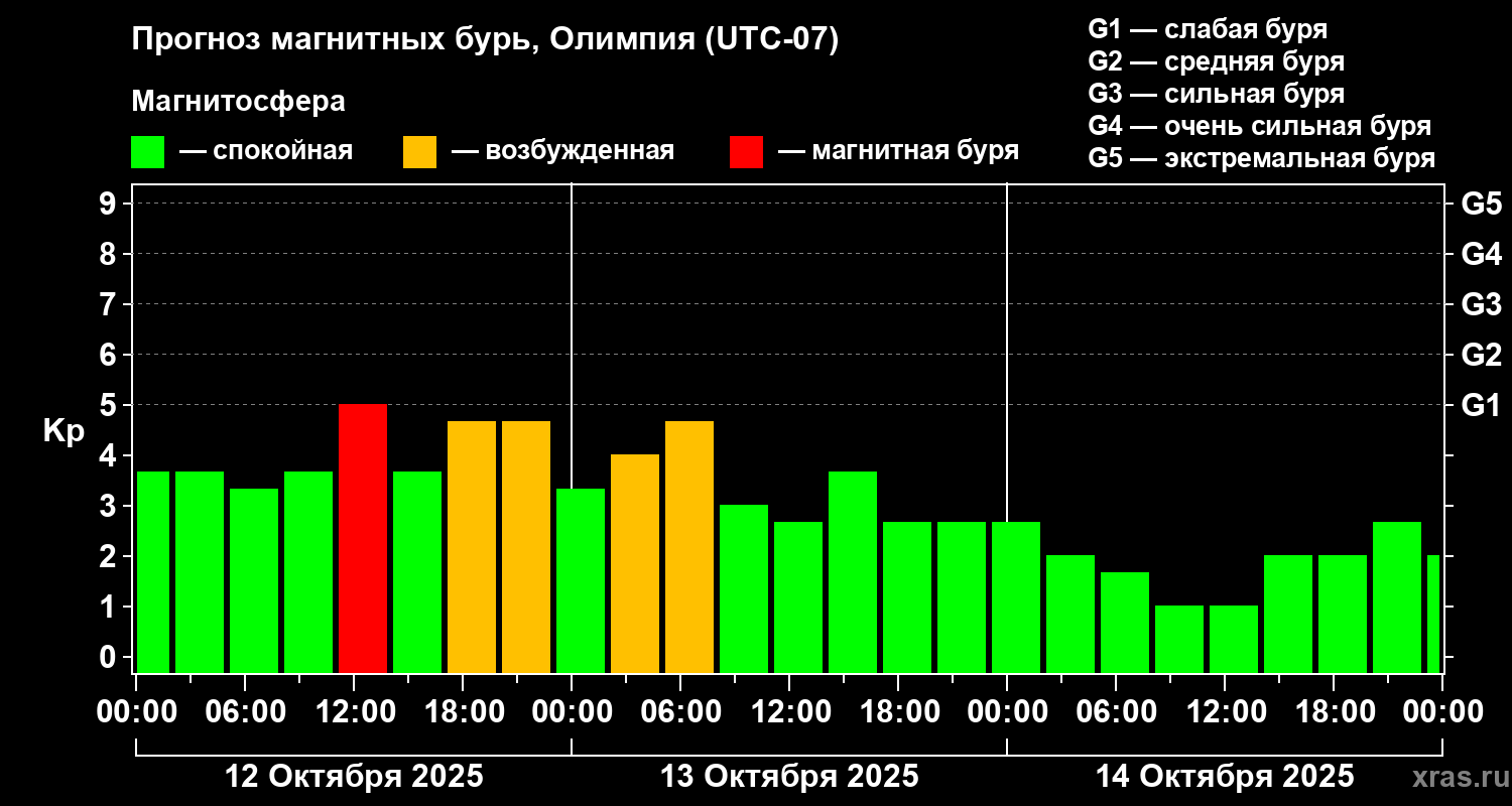 Прогноз магнитных бурь в Олимпии — 12 октября 2025 года