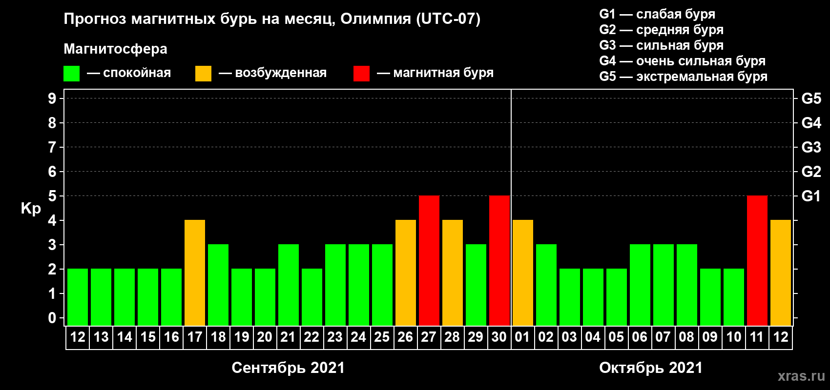 Прогноз магнитных бурь в Олимпии — 12 сентября 2021 года