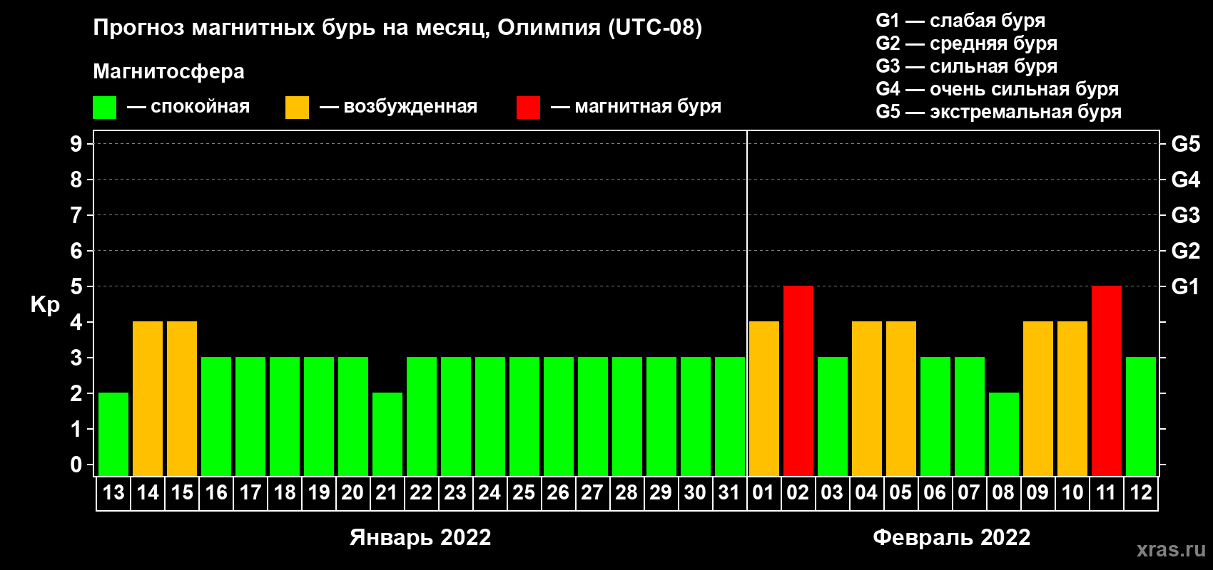 Прогноз магнитных бурь в Олимпии — 13 января 2022 года