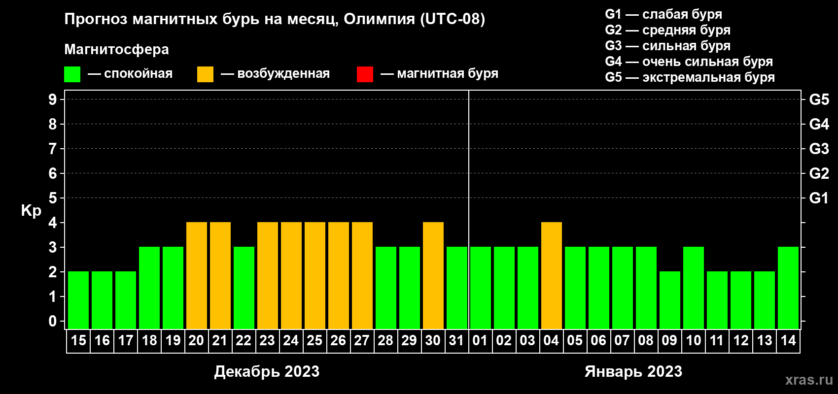 Прогноз магнитных бурь в Олимпии — 15 декабря 2022 года