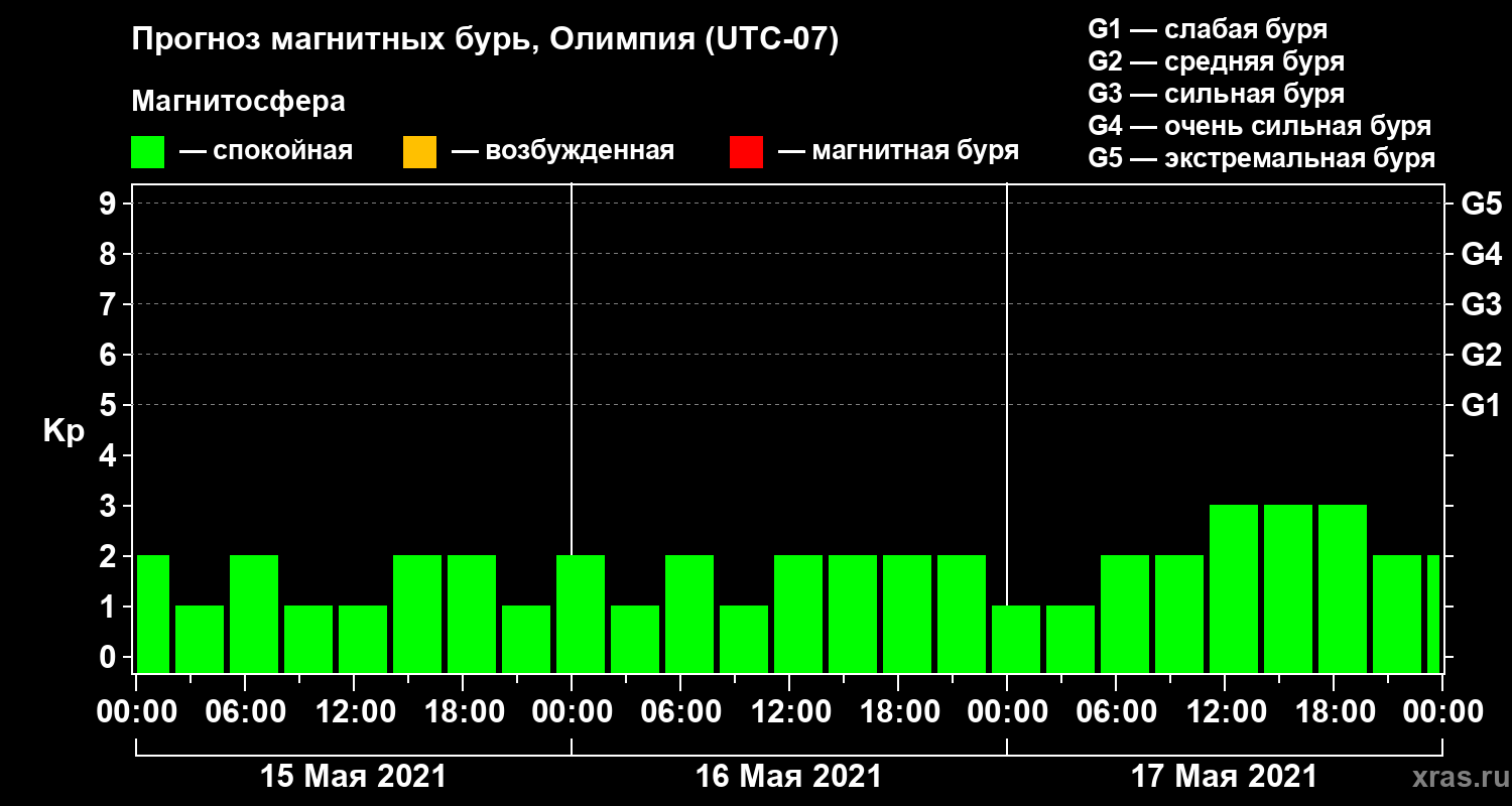 Прогноз магнитных бурь в Олимпии — 15 мая 2021 года