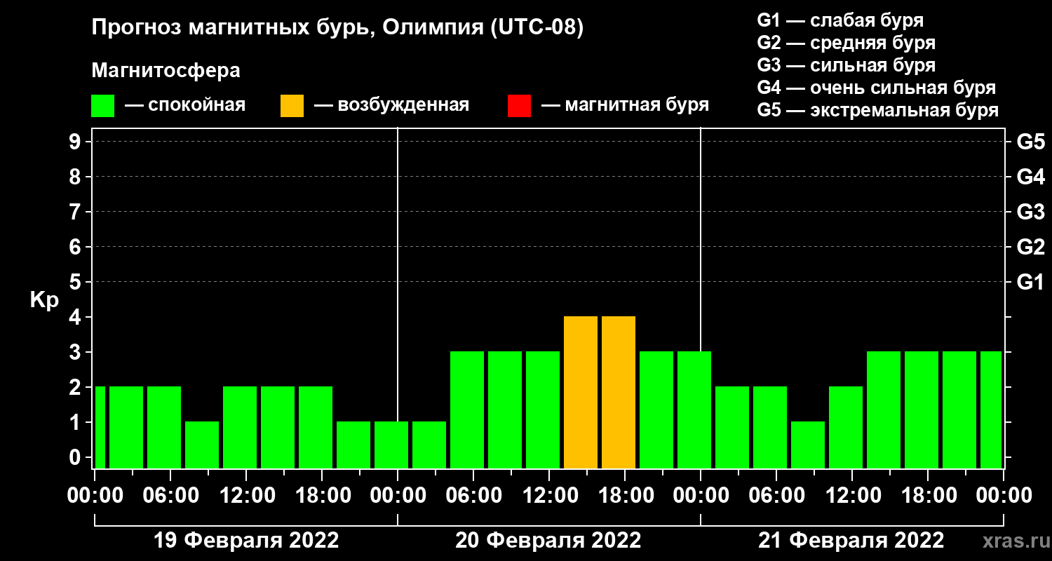 Прогноз магнитных бурь в Олимпии — 19 февраля 2022 года