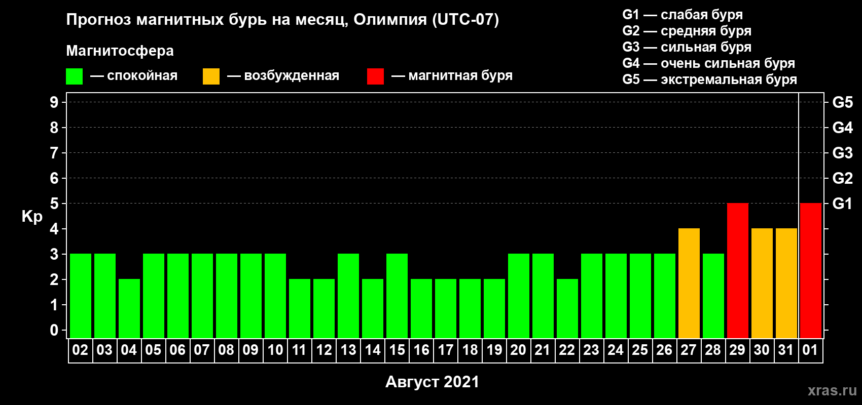 Прогноз магнитных бурь в Олимпии — 2 августа 2021 года