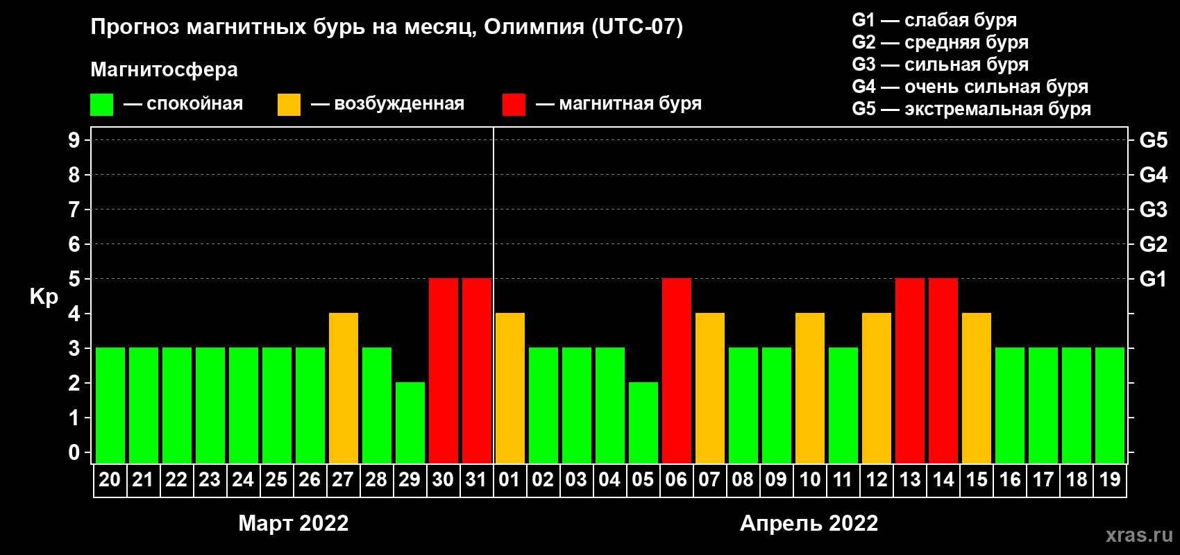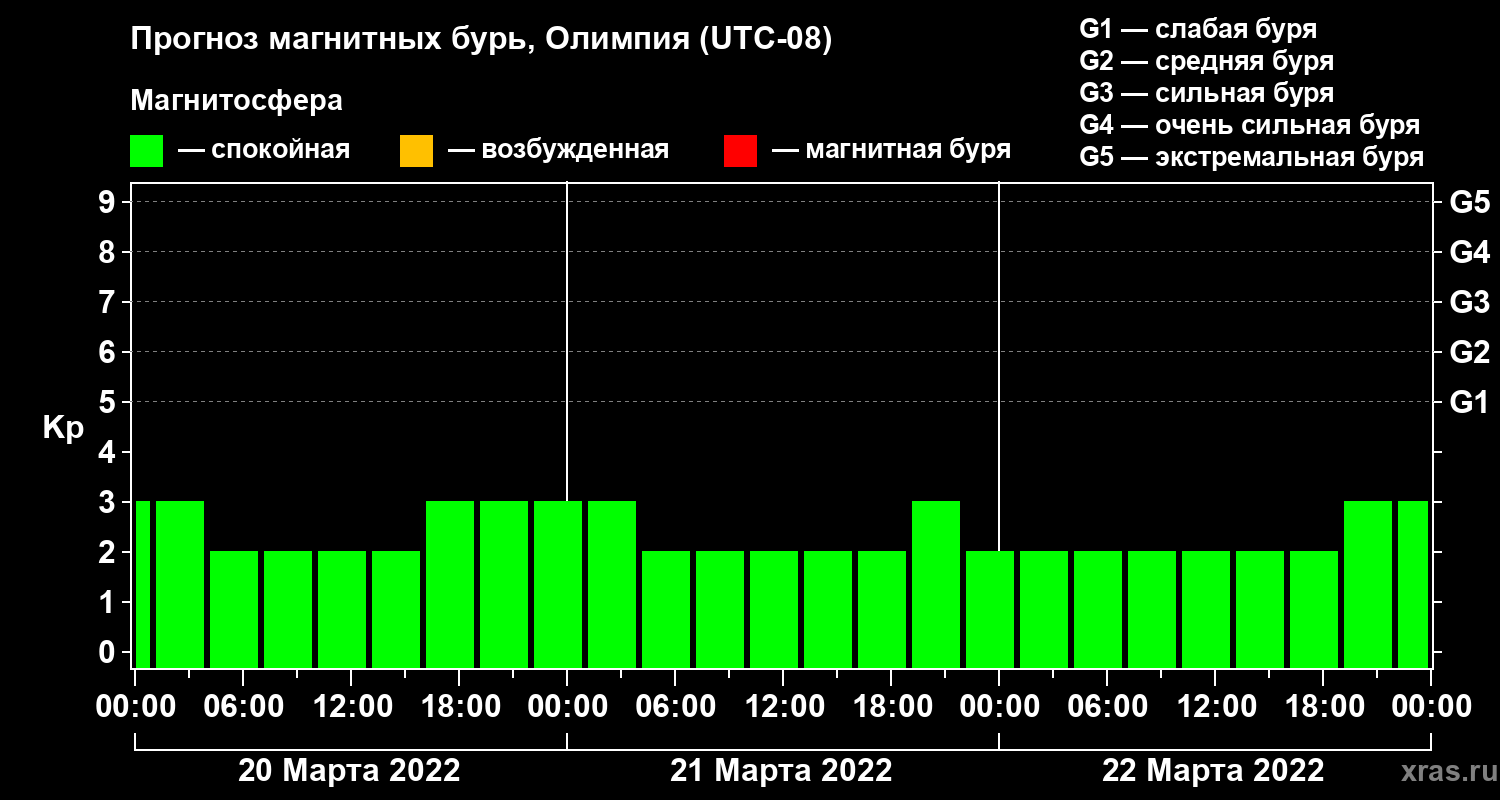 Прогноз магнитных бурь в Олимпии — 20 марта 2022 года