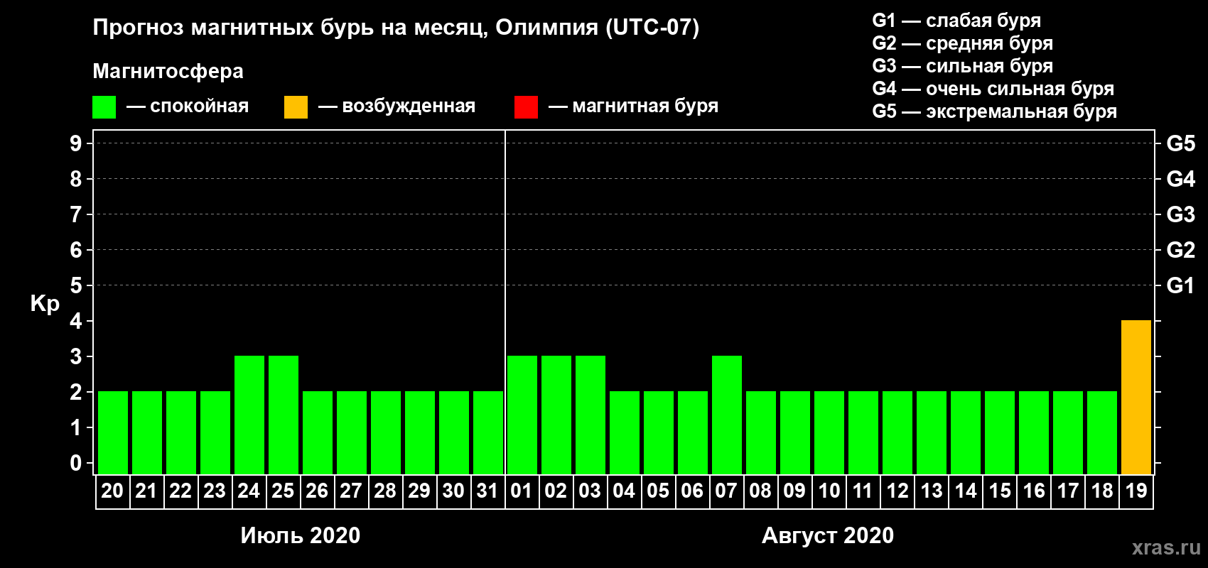 Прогноз магнитных бурь в Олимпии на 20 июля 2020 года