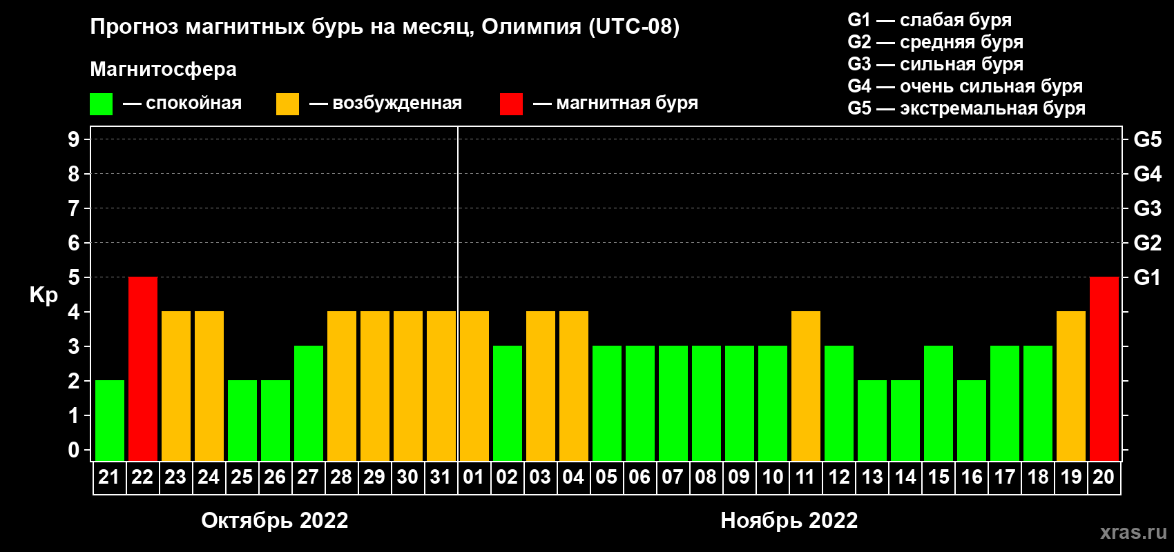 Прогноз магнитных бурь в Олимпии — 21 октября 2022 года